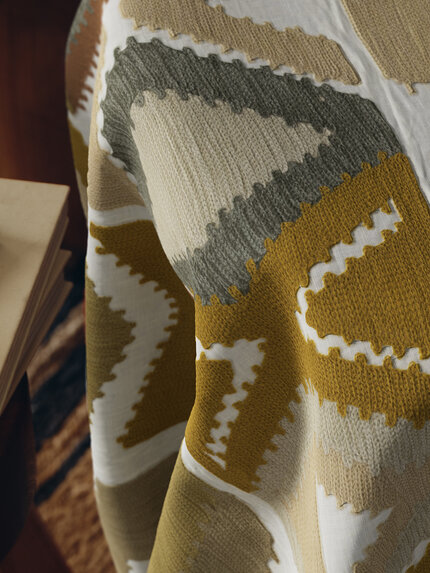 Die türkischen und kasachischen Kilim-Teppiche liefern die Inspiration für Solola. In Indien, im Einklang mit der Tradition und dem Know-how. Der Leinenstoff mit European Flax-Zertifikat wird von versierten Kunsthandwerkern von Hand mit wolligen Garnen bestickt. Die sonnigen Farben orientieren sich an den Webereien in Guatemala und anderen Ländern.