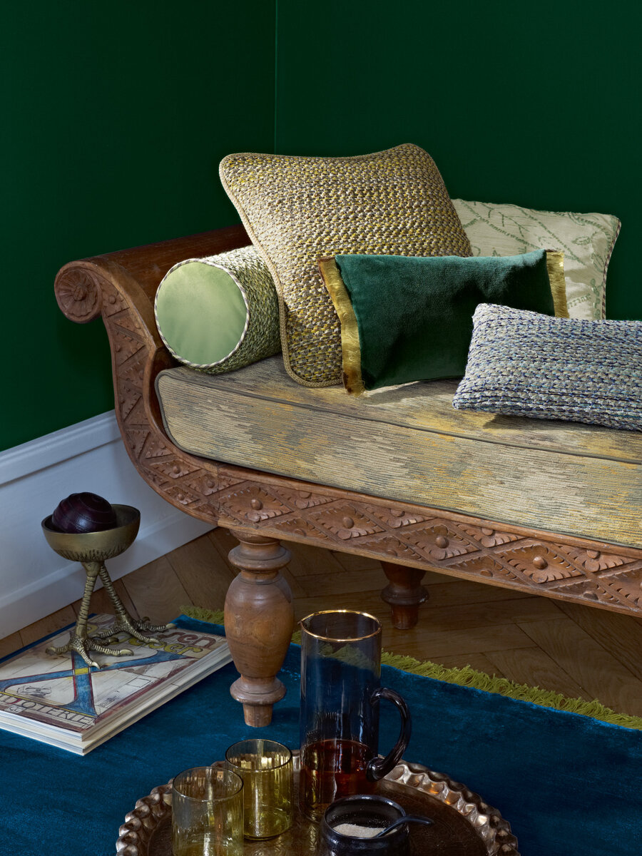 Eine Dekoration, die mit ihrer horizontalen Struktur und dem interessanten Farbwechsel der Garne überzeugt. Die Schattierungen und Flottierungen des Gewebes verleihen dieser Dekoration mit ihrer ausgeprägten textilen Struktur einen unverwechselbaren Charakter.
