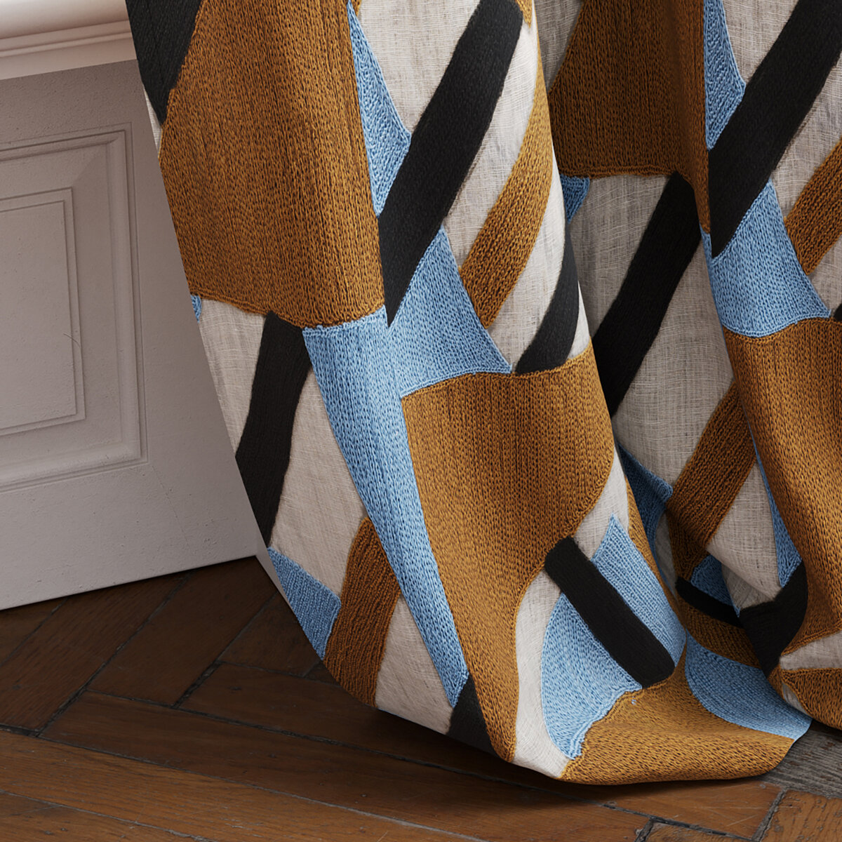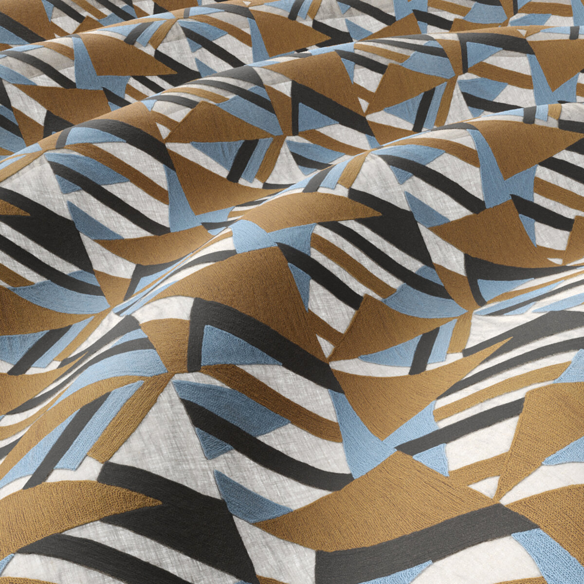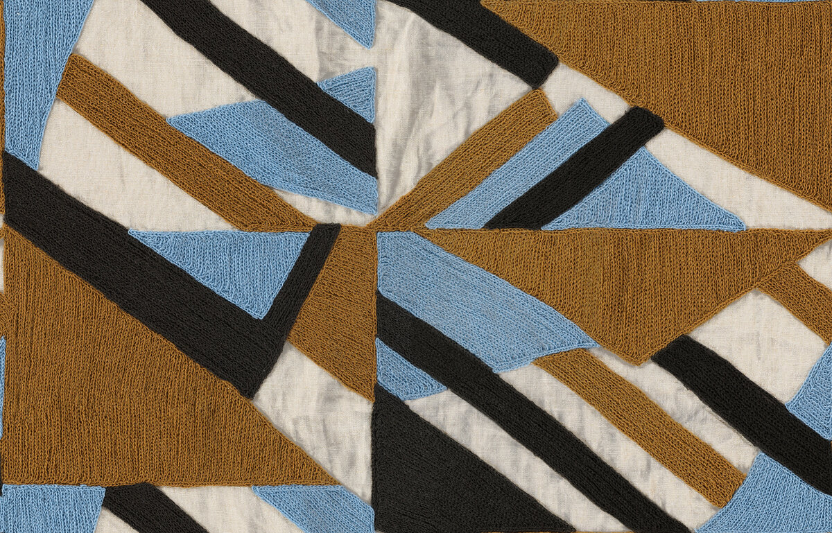 Inspiriert von der abstrakten Kunst des Konstruktivismus formieren sich diagonale Streifenmotive und dreieckige Flächen zu einem kühnen geometrischen Alloverdesign. Die leicht erhabenen Motive werden von Hand auf den natürlichen Leinenfond aufgenäht.