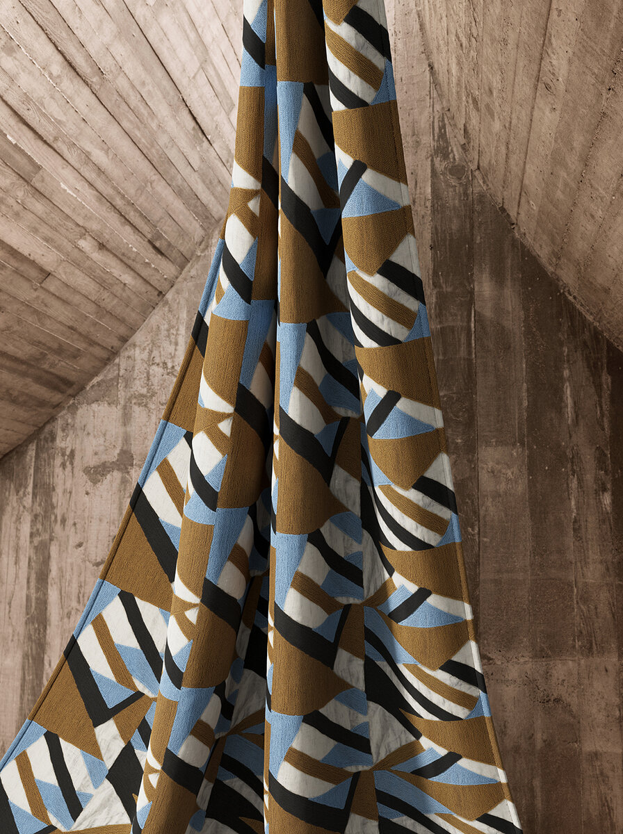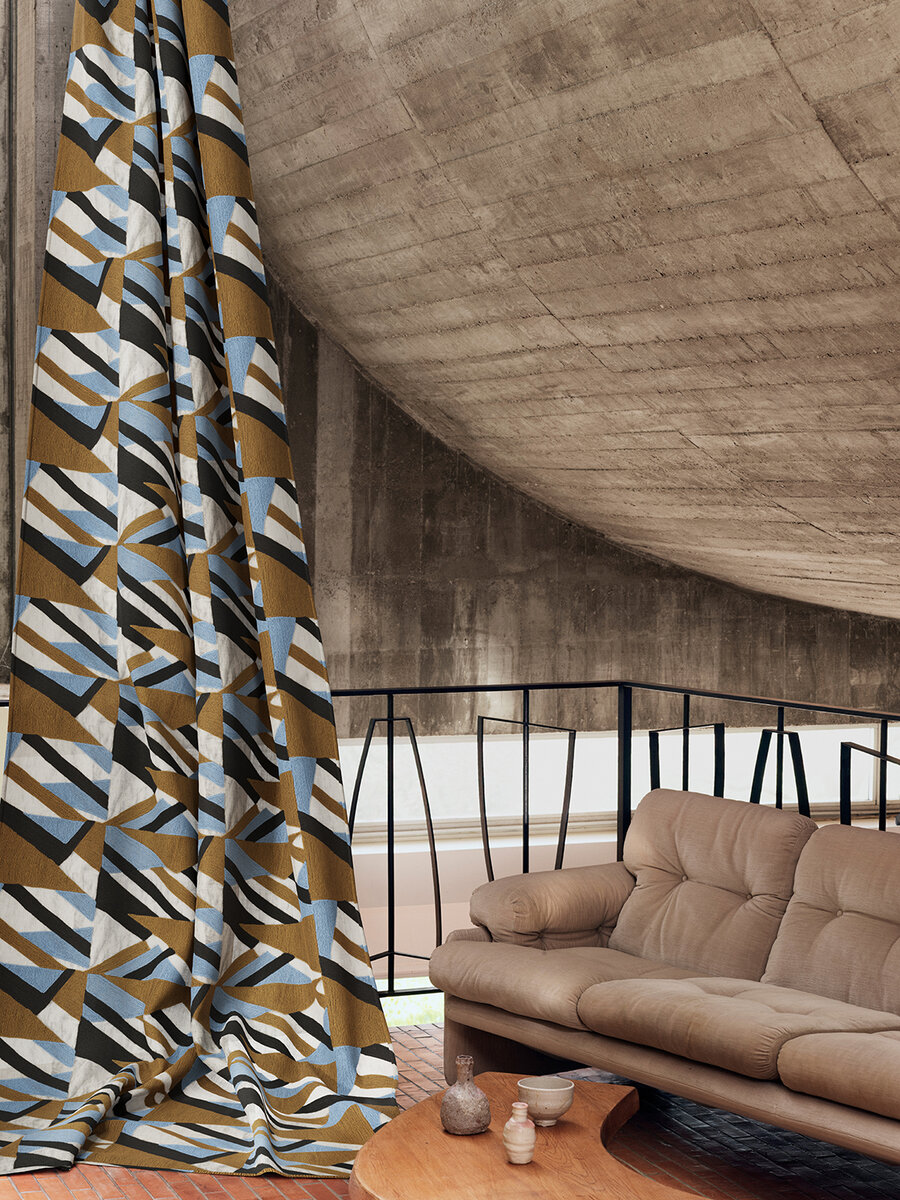 TRIANGLES entfaltet seine unverwechselbare Wirkung gleichermaßen als Dekostoff am Fenster, als großzügige Kissenlandschaft, als Bettkopfteil oder als Wandbespannung.