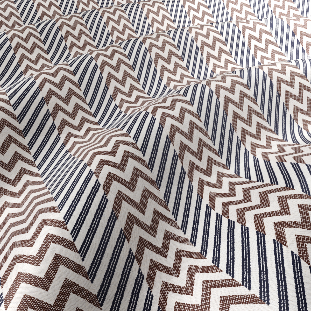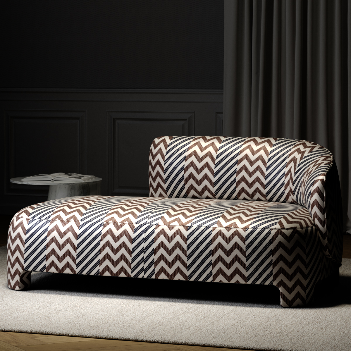 VALBONNE trägt breite vertikale Streifen als modernistisches Fischgrätenmuster und besticht durch sein Spiel mit dem Farben. Die Neuinterpretation in Jacquard ist von eleganten Schussfäden mit natürlicher Struktur durchzogen.