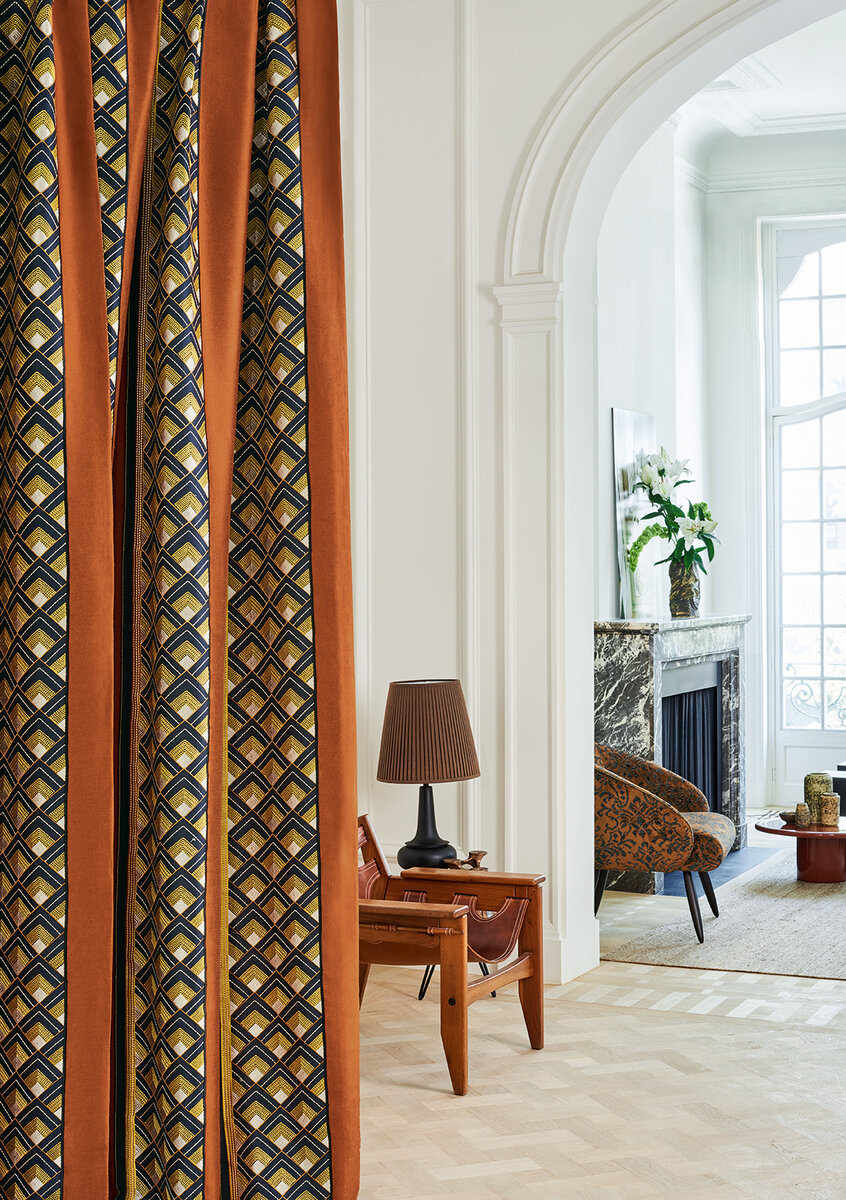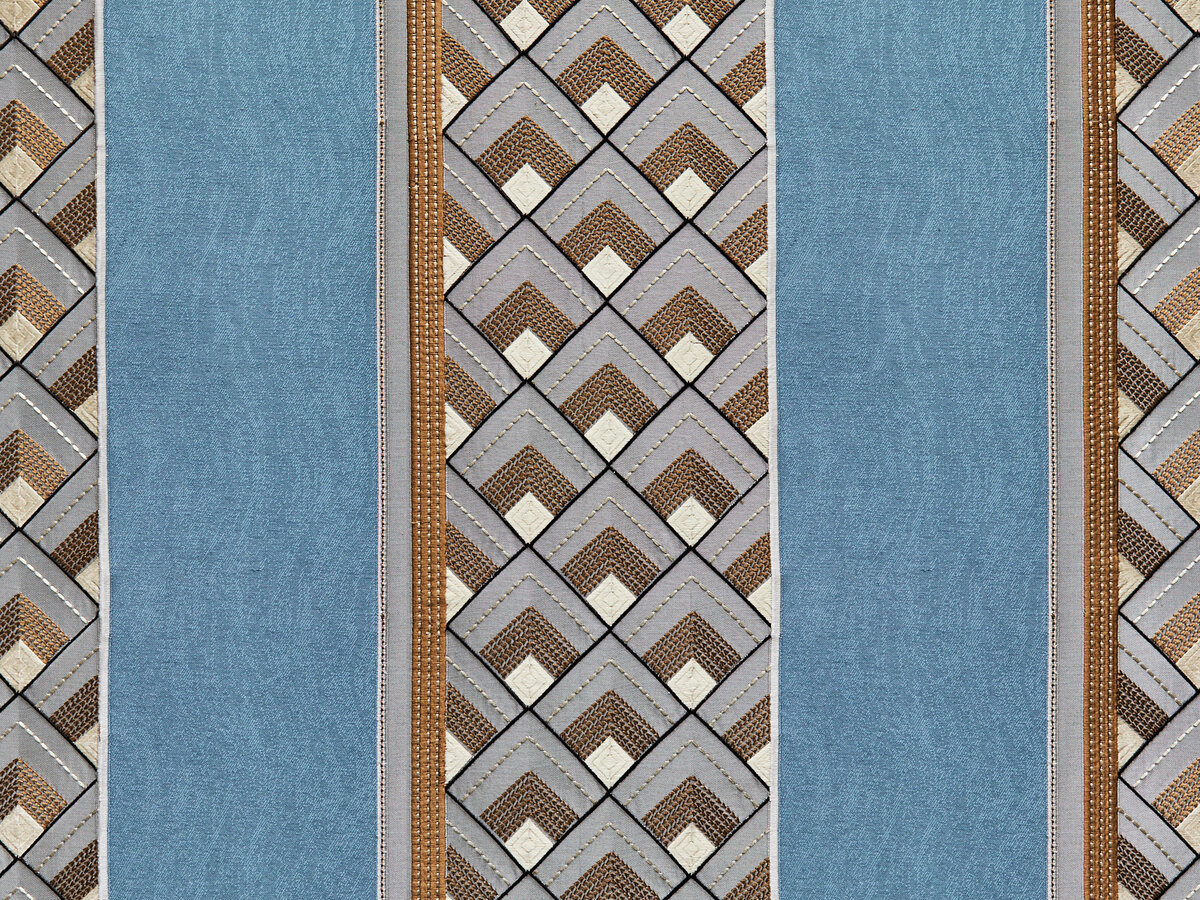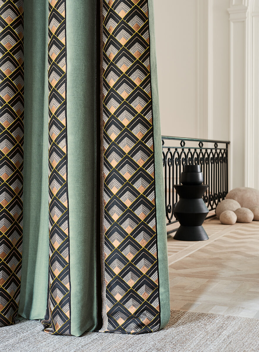 VISIONE hat sich von der Architektur der Goldenen Zwanzigerjahre inspirieren lassen. Die handwerkliche Stickerei dieses noblen Dekorationsstreifens fasziniert durch die subtile Farbigkeit und sein dreidimensionales Relief. Der elegante Changeant-Effekt des Jacquard-Fonds vervollständigt die Raffinesse und Modernität dieses anspruchsvollen Textils.