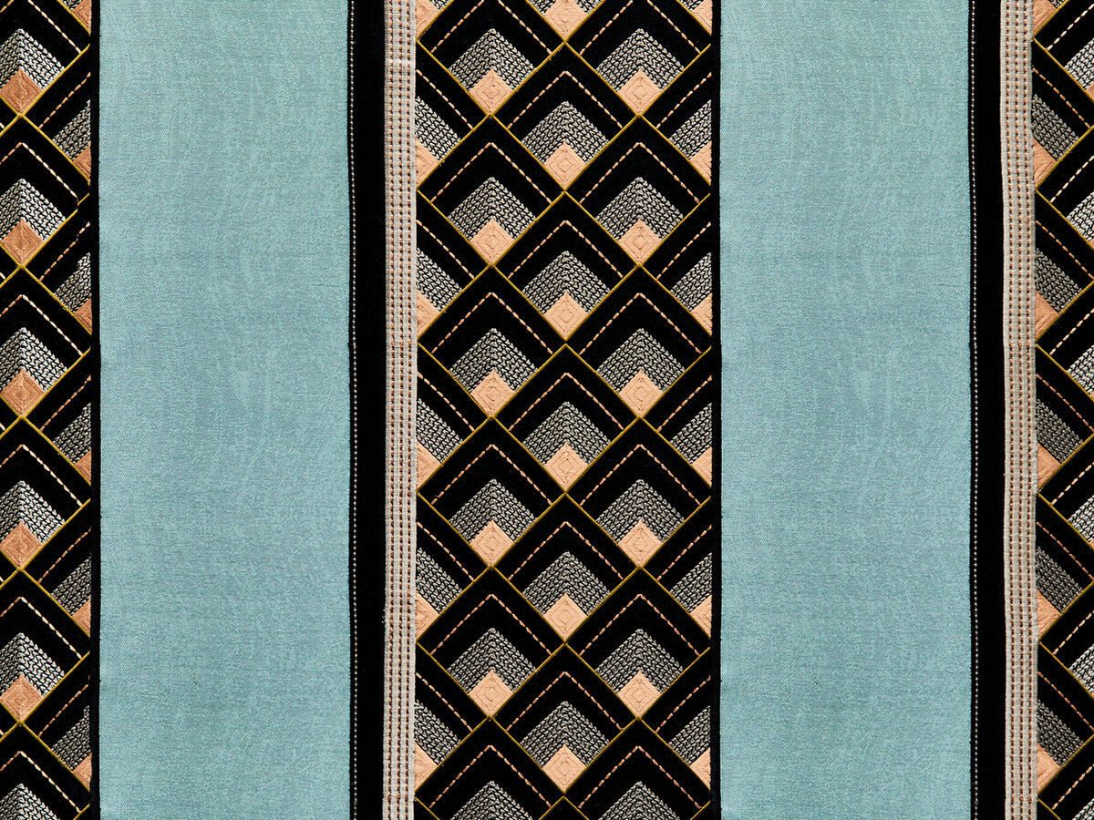 VISIONE hat sich von der Architektur der Goldenen Zwanzigerjahre inspirieren lassen. Die handwerkliche Stickerei dieses noblen Dekorationsstreifens fasziniert durch die subtile Farbigkeit und sein dreidimensionales Relief. Der elegante Changeant-Effekt des Jacquard-Fonds vervollständigt die Raffinesse und Modernität dieses anspruchsvollen Textils.