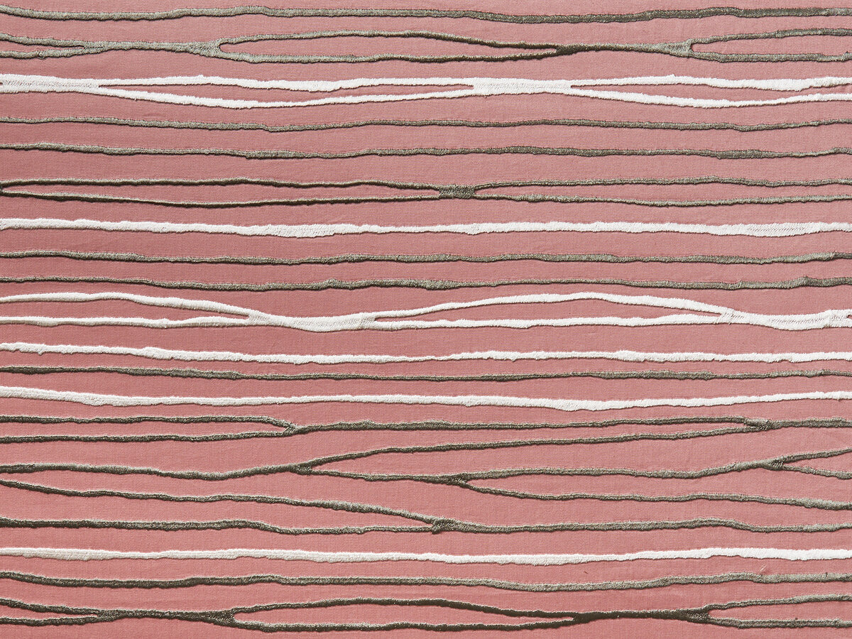 Diese elegante, horizontal verlaufende Stickerei ist die moderne Interpretation einer Holzmaserung. Jeweils zwei Stickfarben spielen mit der Grundfarbe des eleganten Baumwoll-Satins. In großzügigen Wellen drapiert, kommt die horizontale Musterung besonders gut zur Geltung.