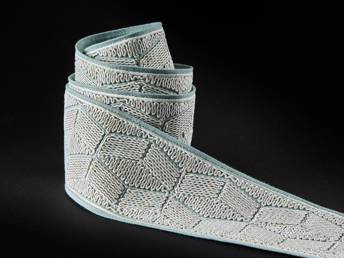 Bei ZELDA handelt es sich um dichten Kordelstick, dessen gewundenes Pfeilspitzendesign nach Zelda Fitzgerald benannt wurde, eines der ersten „flapper girls“ der USA und ein Sinnbild des Zeitalters des Jazz. Ein unverwechselbarer Stickstich namens „Machine Dori“ aus Viskosekordelgarn wird auf ein Baumwoll-Leinengewebe appliziert. ZELDA ist in Elfenbein-, Bronze- und Mineralkolorierungen erhältlich, die so klassisch sind wie die Legende, die zu seinem Namen inspiriert hat.