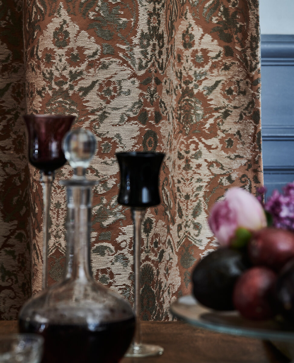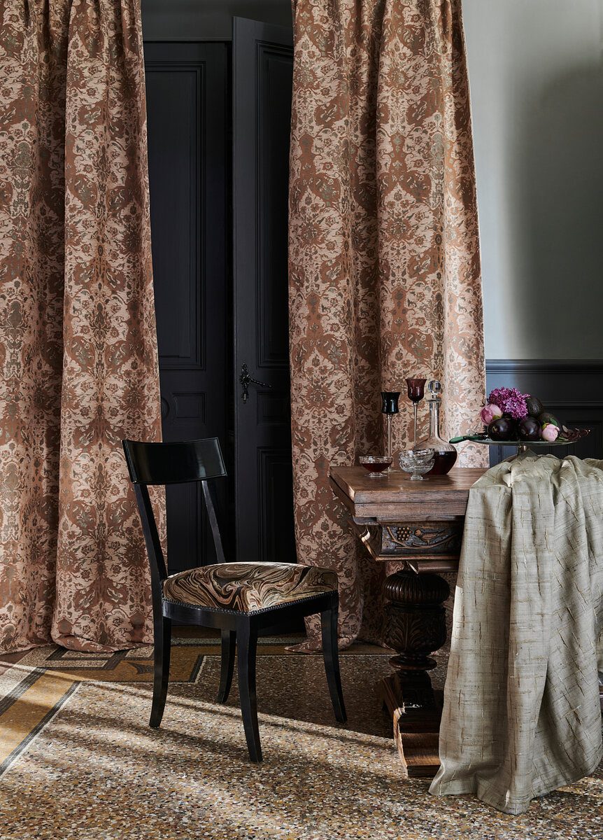 The timeless interpretation of this damask design gives this softly flowing decorative item its special sophistication. A fresco in a villa in Florence was the inspiration for this intricate jacquard, which is woven on a very fine silk-like warp. After weaving, the fabric is refined with a gentle brush finish, giving it its modern character and special hand.
