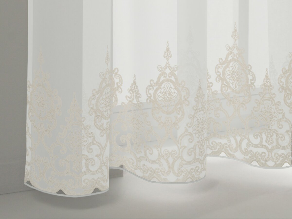 The linen-like base of this elaborate inbe-tween creates an appealing contrast with the romantic border embroidery and the playful scalloped hem. This delicate piece, laden with rural nostalgia, is available in three subtle, natural colours.