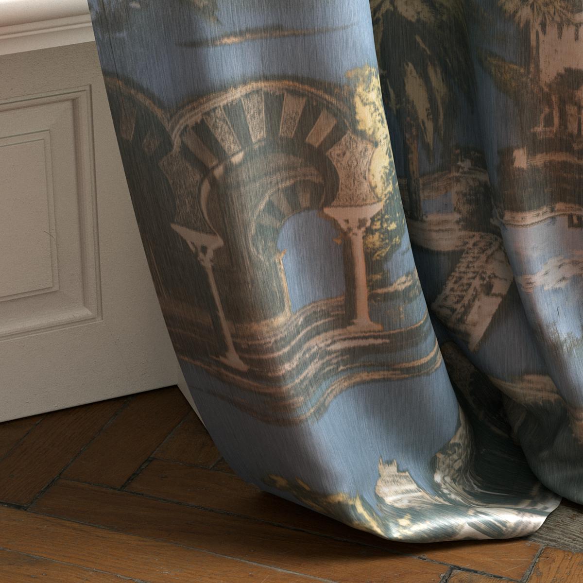 Delicate, digitally printed warp threads lend the fabric an impressive depth, reminiscent of Andalusian mosaics, meticulously designed gardens, and elegant arcades. The shimmering taffeta background accentuates the harmonious balance between reflection and structure.
