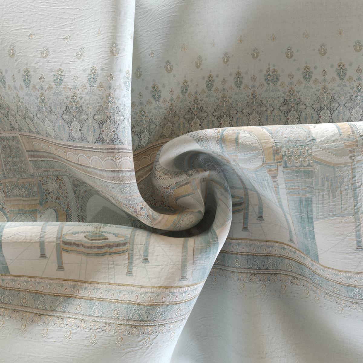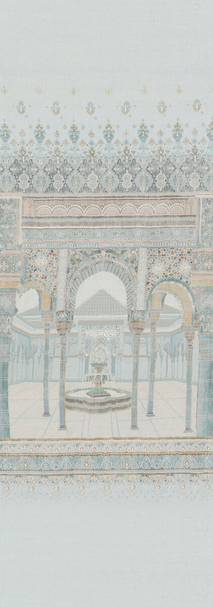 Inspired by the arcades and courtyards of the Alhambra in Granada, a pattern of geometric ornaments and arabesques unfolds in the style of Moorish architecture. The print serves as a subtle foundation, while the three-dimensional embroidery creates striking relief accents.