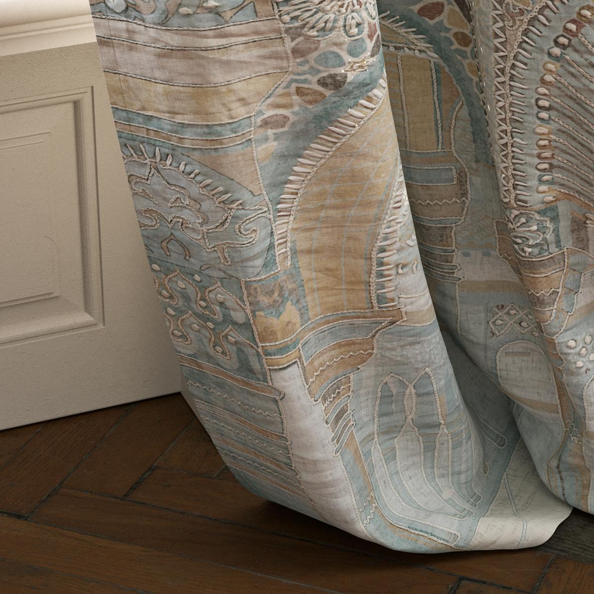 This spectacular panel combines artistic printing and delicate hand embroidery in raffia on a fine linen base.
