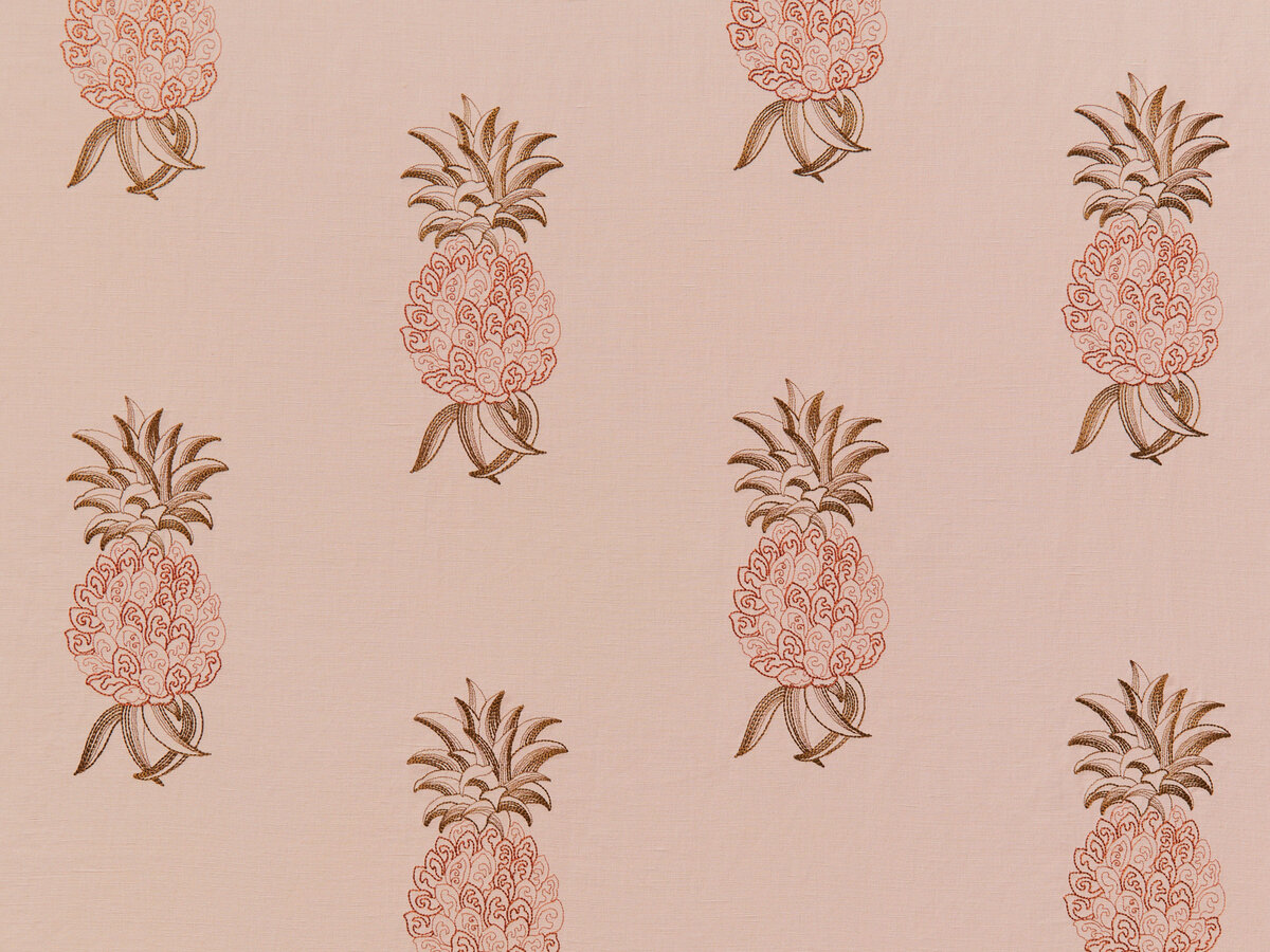 Traditionally recognized as a welcoming symbol, the pineapple conveys a sense of hospitality and warmth. Originally drawn by hand, ANANAS EMBROIDERY incorporates two vibrant viscose yarns on a blended cloth. The beauty of this embroidery is in the stitch technique. It uses the same yarn at varied thicknesses to create an illusion of depth and color. This playful embroidery comes in four sophisticated colors that perfectly capture the spirit of the West Indies.