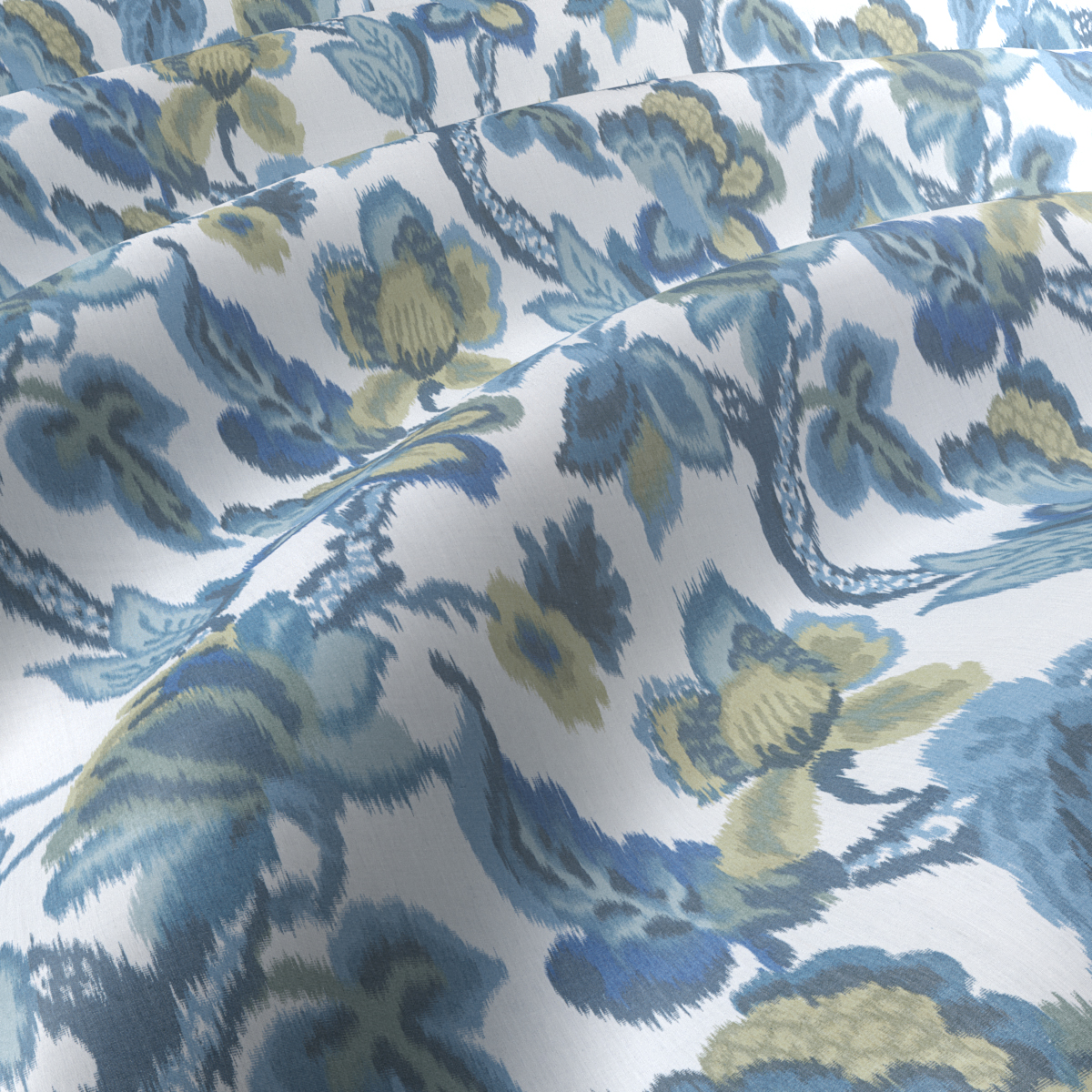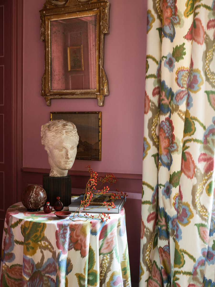 ANYA is a prime example of an increasingly rare form of textile craftsmanship. The large-format Jacobean design is already applied to the fine cotton warp before the weaving process begins. In the elaborate warp printing technique, the warp threads shift slightly in relation to each other during weaving, creating an intentionally blurred effect of the multicolored motifs. The result: a deliberately stunning decorative creation whose charm lies in its imperfection.