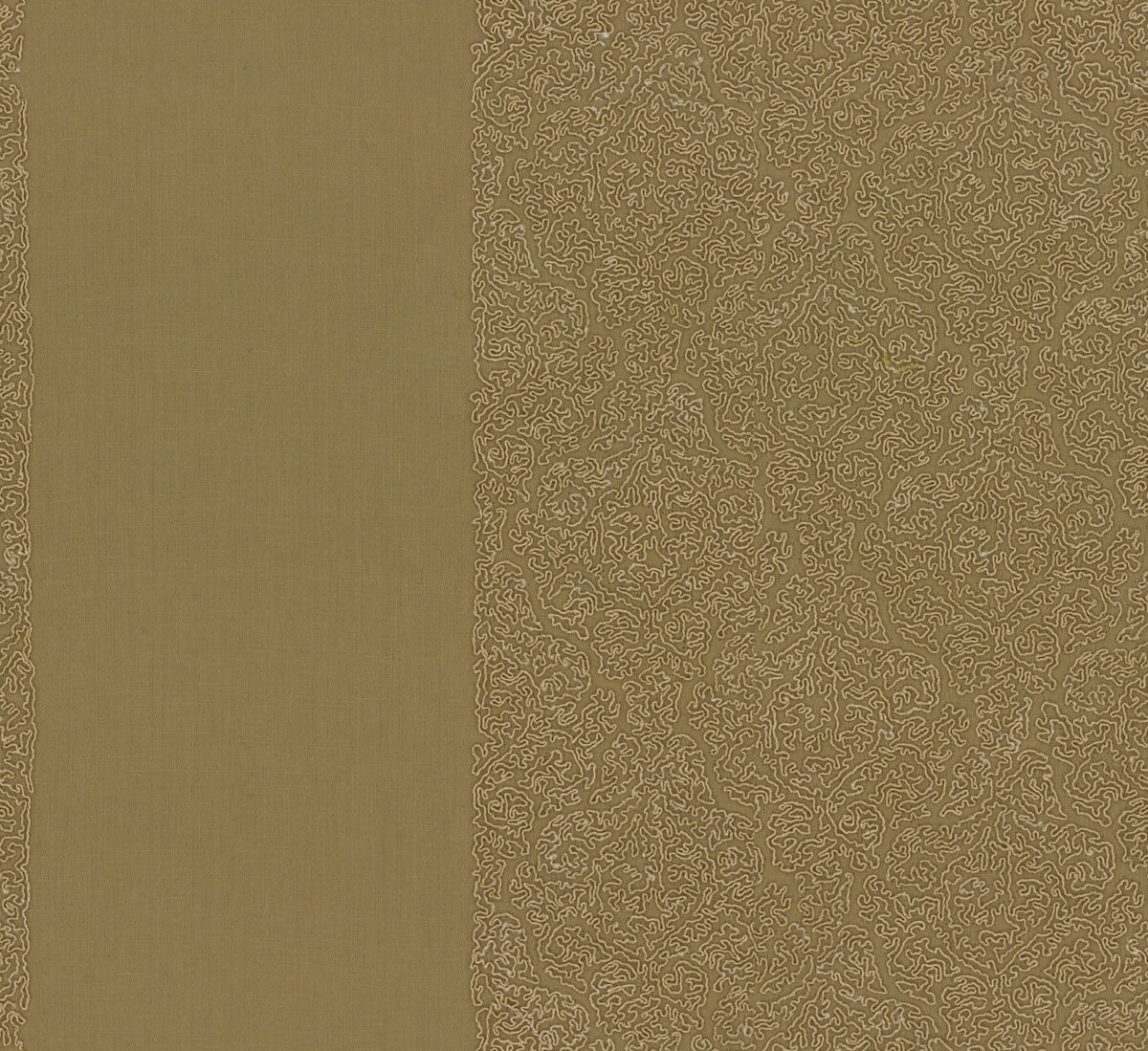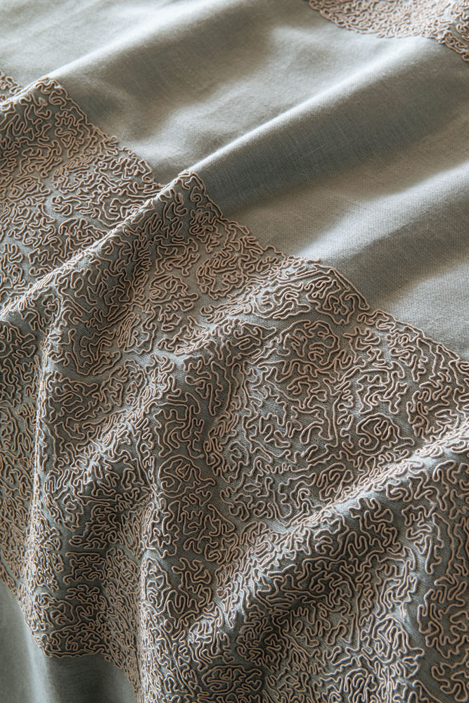 A noble linen satin forms the base for this exquisite cord embroidery, inspired by the intricate ornamentation of the Alhambra.
