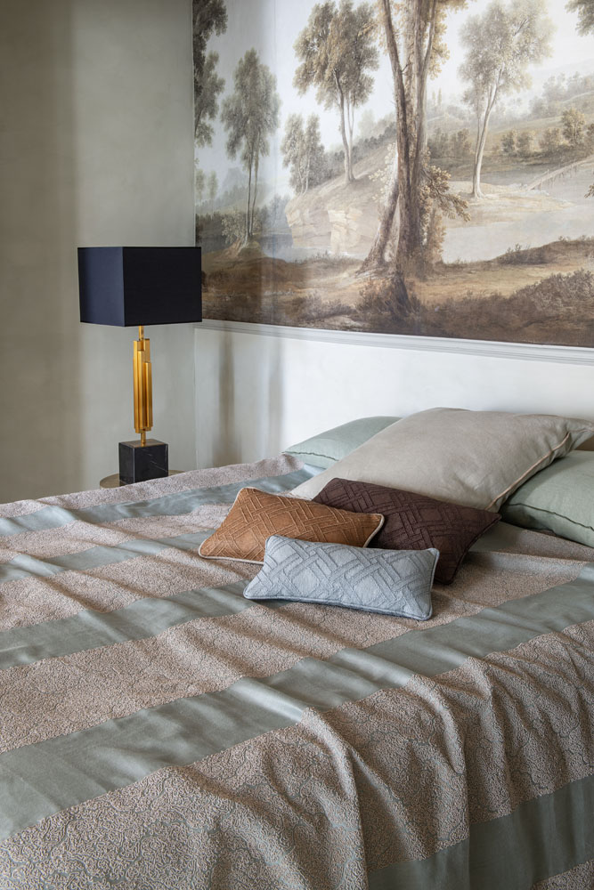 Subtle, raised lines create a delicate stripe motif, evoking the elegant arabesques and geometric patterns of Moorish architecture. The sophisticated tone-on-tone embroidery seamlessly blends into the shimmering base, creating a subtle, relief-like texture. The interplay of matte linen and fine embroidery imparts an elegant lightness and timeless grace.