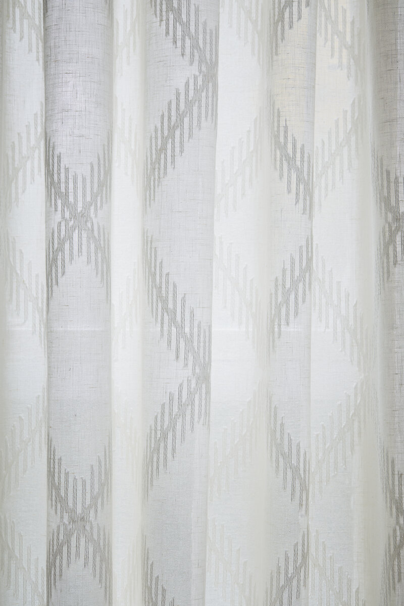 A diamond lattice design in a mid-size scale, ARABLE sheer is woven on a special wide width loom in Turkey. Its staggered edges are created using a traditional fil coupe technique that is clipped on the backside of the fabric for a smooth surface. A blended fabric using natural linen and cotton from Europe, ARABLE has a stone washed finish that radiates casual elegance.