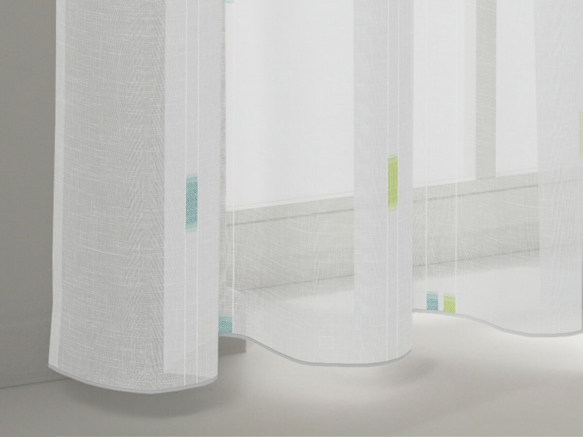 ARCHIMEDES – lovingly woven and shorn. This Scherli fabric (Fil-Coupé) is a transparent and actually shorn textile. Additional effect threads are woven into the base, whose floating ends are later cut off. The result: beautifully fringe-like fluttering at the edges of the motif – for ARCHIMEDES even in two colours including jacquard patterning. The edging with a thick fancy yarn creates a discreet strip.