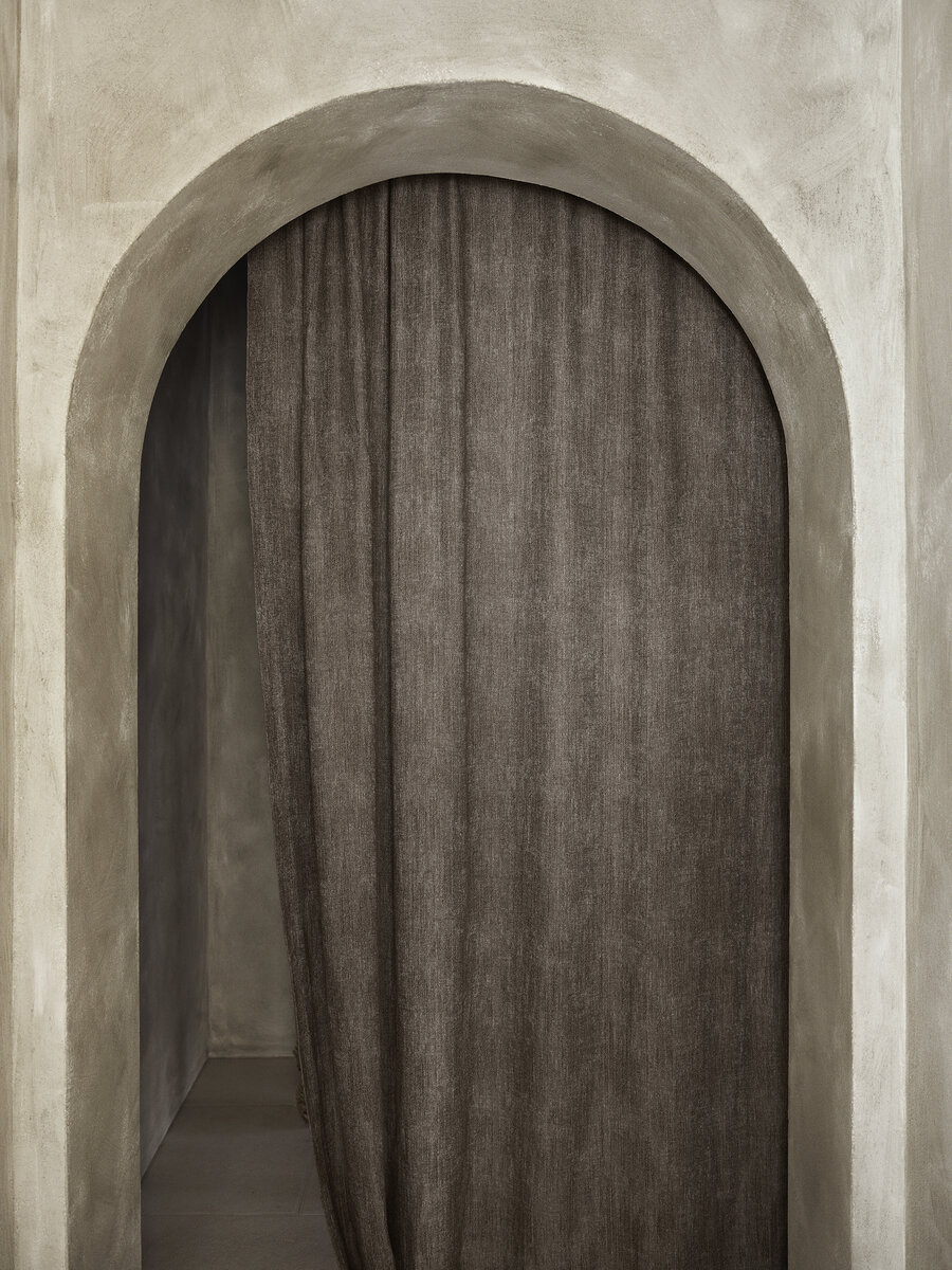 The floor-length décor fabric has its lively aura from the artisanal style jacquard structure. Woven with a variety of thicker and thinner yarns with different textures, the surface attains an exciting relief effect. This is underscored by the fine arrangement of the different fibers.