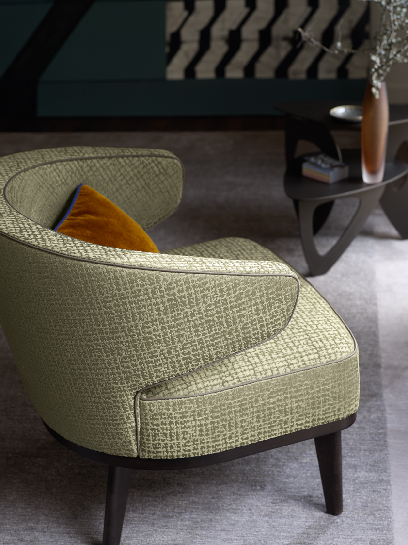 Elegance is the force behind this attractive upholstery fabric. Bebop harmoniously combines satin and chenille. The shining background is broken with a velvet chenille. It creates a three-dimensional overlying structure that gives the piece its volume and noticeably pleasant touch. 30.000 Martindale