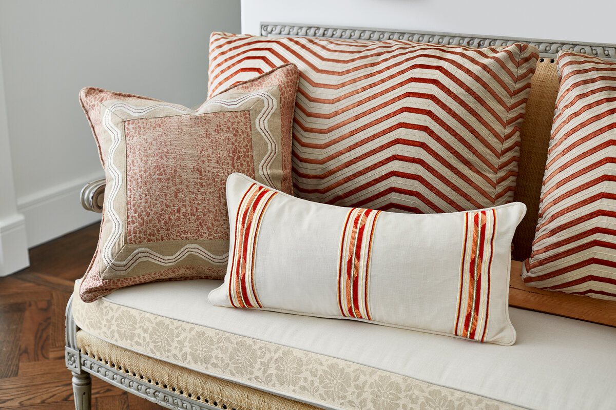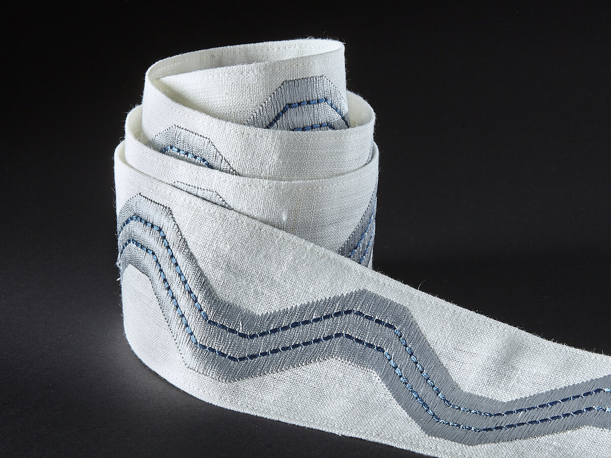 BIG SUR is a embroidery with two colours of viscose, inspired by the ocean hitting the cliff side in the coastal town of Big Sur, California. It is embroidered on linen fabric which is then hand cut and hemmed into each individual tape.