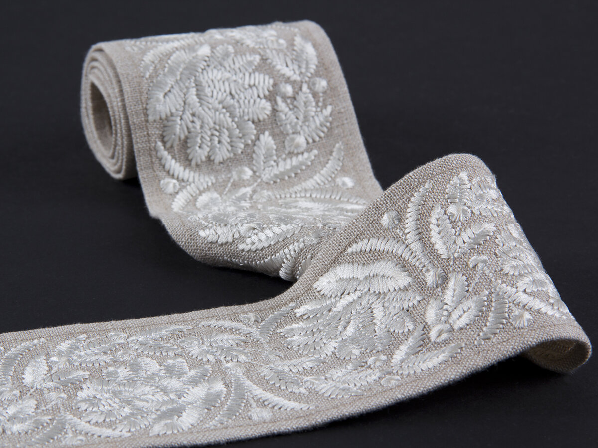 Bismark is a trailing floral and leaf design. It is a satin stitch embroidery on a linen tape. Inspired by the creativity of the House of Cartier. Bismark is a graceful understated adornment to any application.