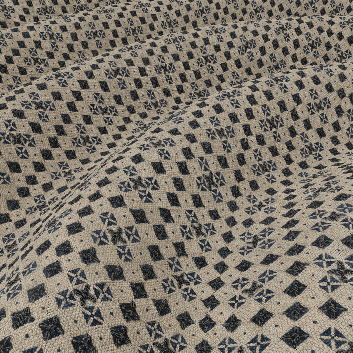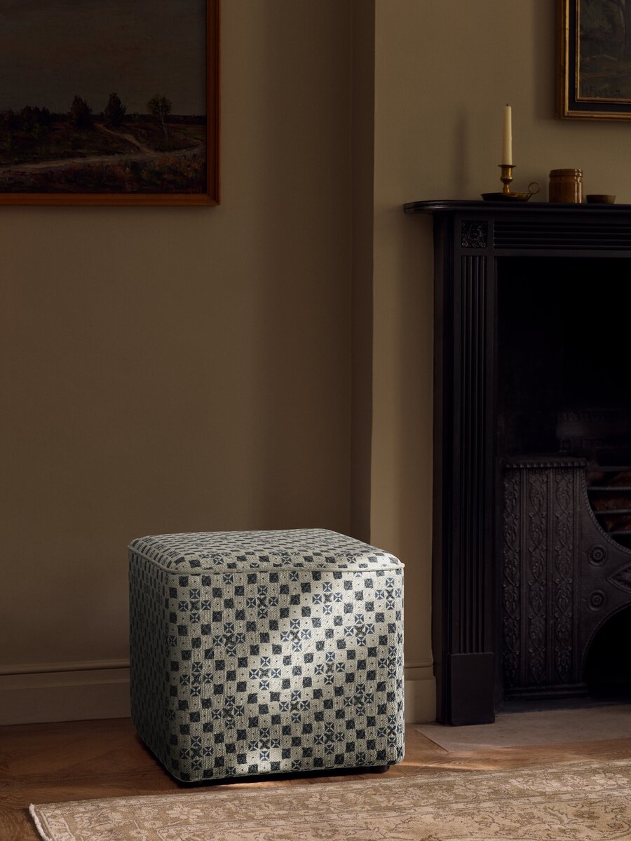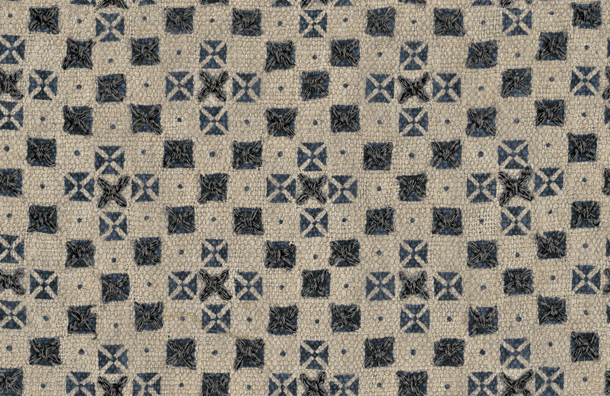 A creative hand-blocked geometric print on a slubbed linen-blend ground inspired by planting patterns in garden design drawings, ‘Boxwood’ is finished with hand embroidery in twisted cotton, creating loose, architecturally inspired patterns that dance across the cloth. The result is a highly textural and expressive decorative fabric with an intense character.