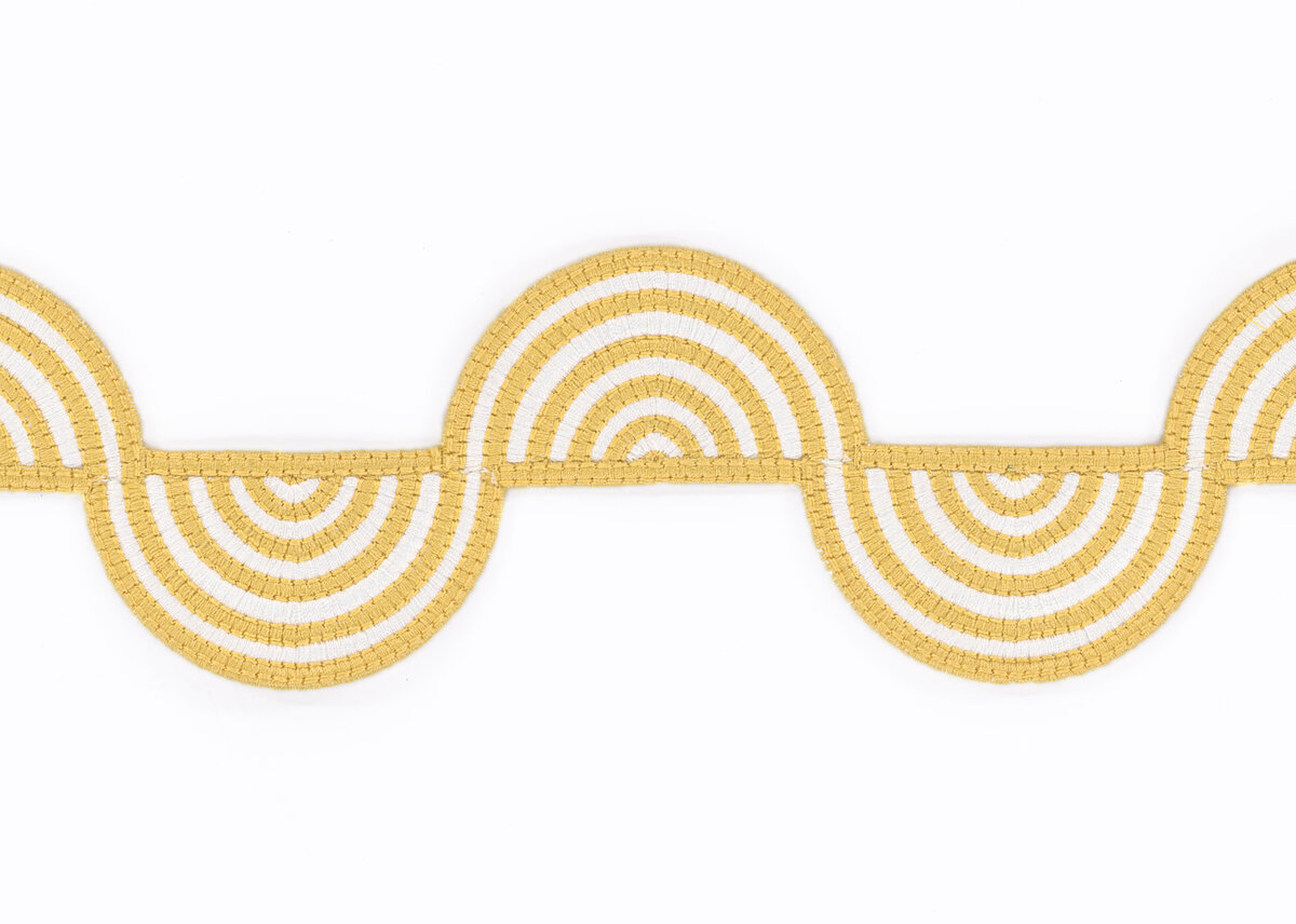 Cancan is a convivial design with a semi-circular motif alternating in direction as it travels up the braid. Skillfully embroidered and inspired by the colourful skirts of cancan dancers as they move in the kick line, this design can be used alone or layered to create a mesmerising geometric trim with a myriad of colour possibilities.