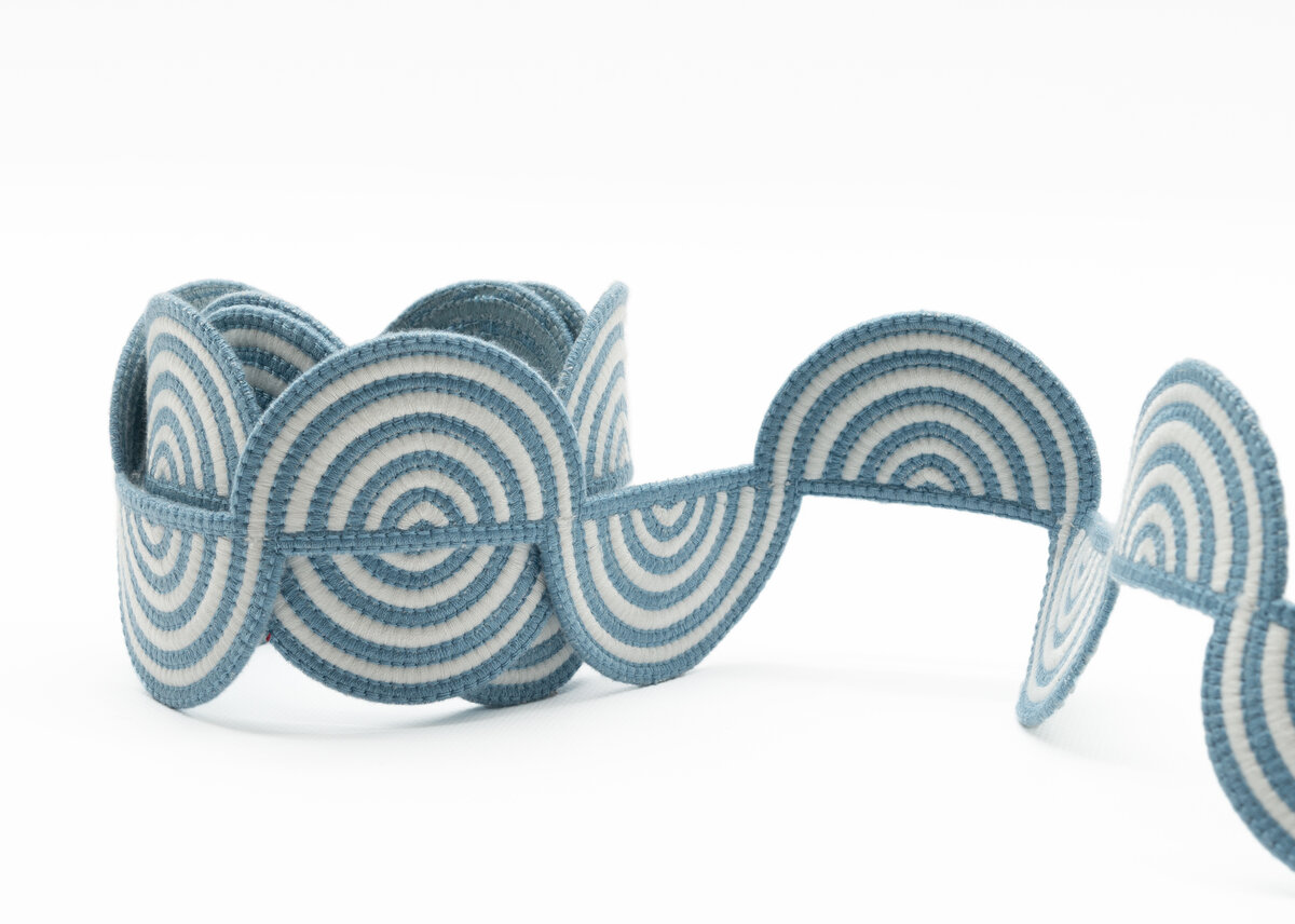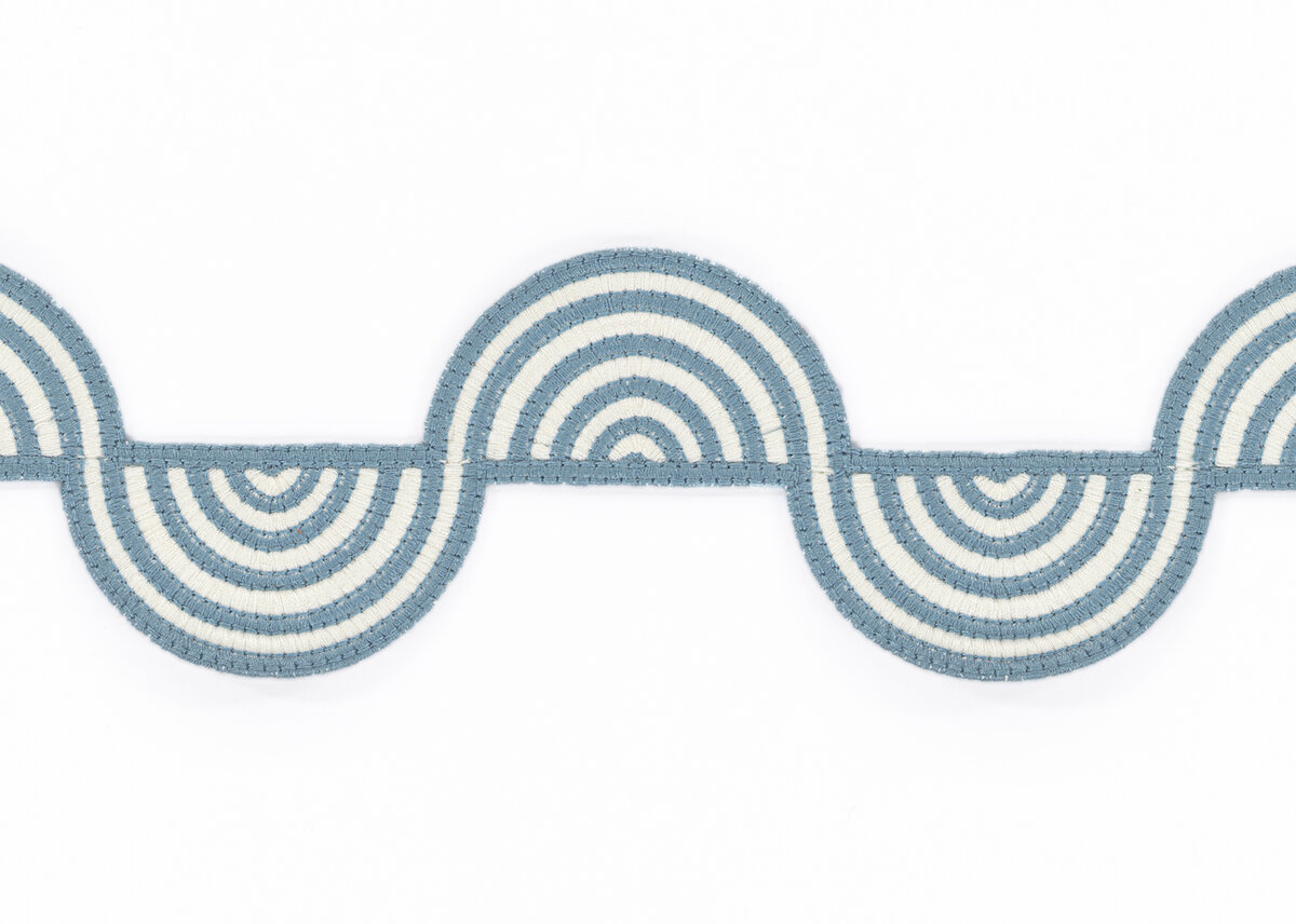 Cancan is a convivial design with a semi-circular motif alternating in direction as it travels up the braid. Skillfully embroidered and inspired by the colourful skirts of cancan dancers as they move in the kick line, this design can be used alone or layered to create a mesmerising geometric trim with a myriad of colour possibilities.