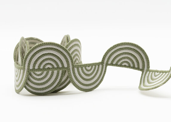 Cancan is a convivial design with a semi-circular motif alternating in direction as it travels up the braid. Skillfully embroidered and inspired by the colourful skirts of cancan dancers as they move in the kick line, this design can be used alone or layered to create a mesmerising geometric trim with a myriad of colour possibilities.