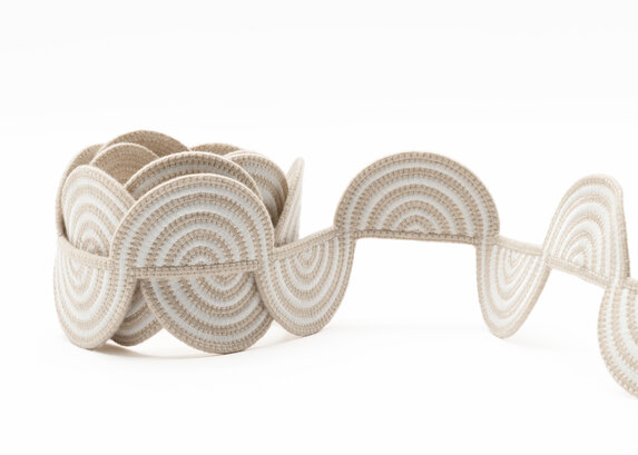 Cancan is a convivial design with a semi-circular motif alternating in direction as it travels up the braid. Skillfully embroidered and inspired by the colourful skirts of cancan dancers as they move in the kick line, this design can be used alone or layered to create a mesmerising geometric trim with a myriad of colour possibilities.