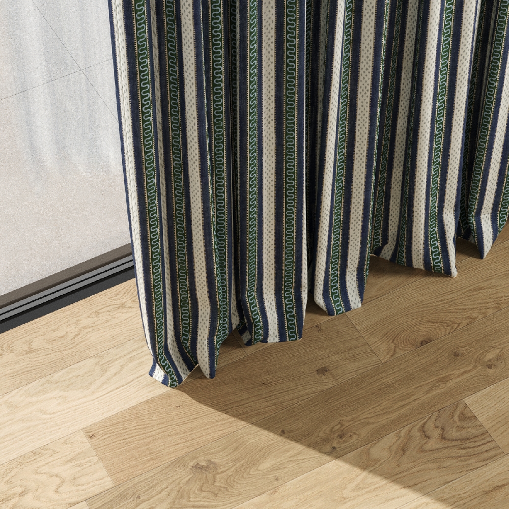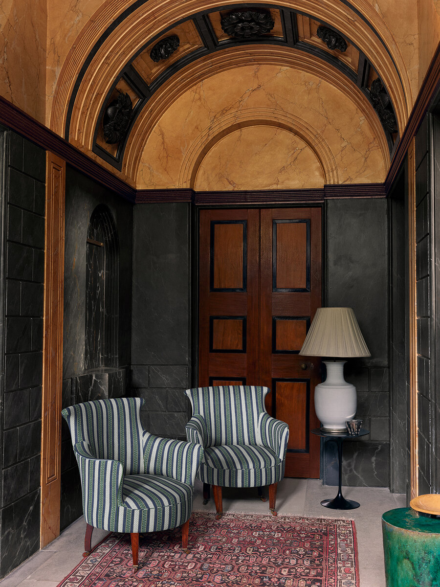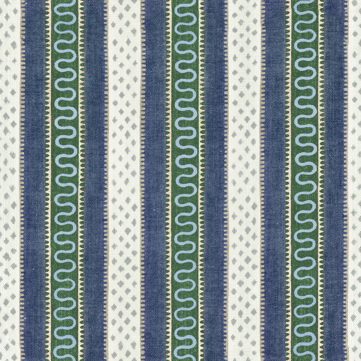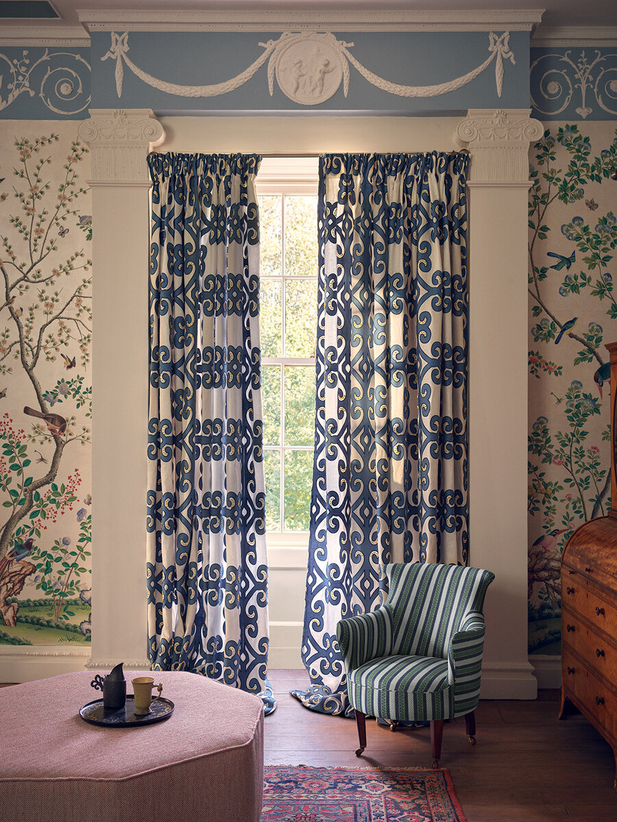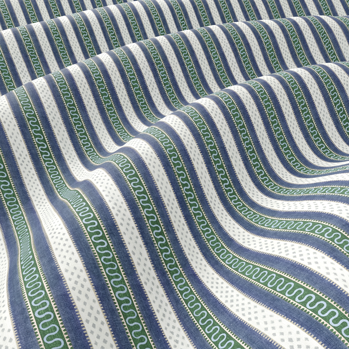 A dynamic and spirited print inspired by the hand-painted motifs used to decorate the tents and trailers of travelling performers, ‘Carnival Stripe’ embraces a playful composition and energetic colour palette. Printed on a cotton-linen base, the design is suitable for both drapery and upholstery, and makes an uplifting addition to any scheme.