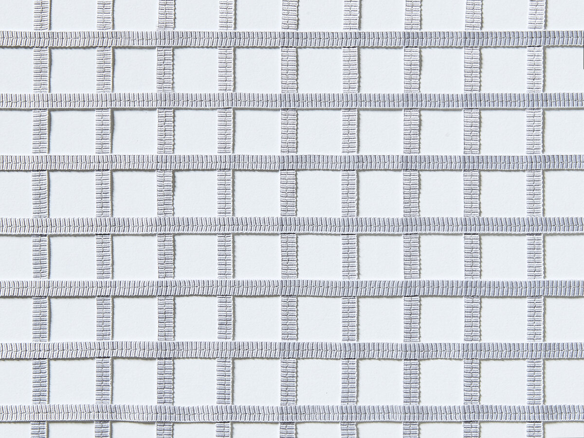 CASE draws you in with its modern grid pattern. Two-tone woven ribbons are sewn to a water-soluble fleece in its special manufacturing process. During the subsequent washing step, this fleece dissolves and leaves behind a mesh-like, geometric textile. CASE has a wide closing fold made from stable fabric at the top and bottom to simplify the finishing process.