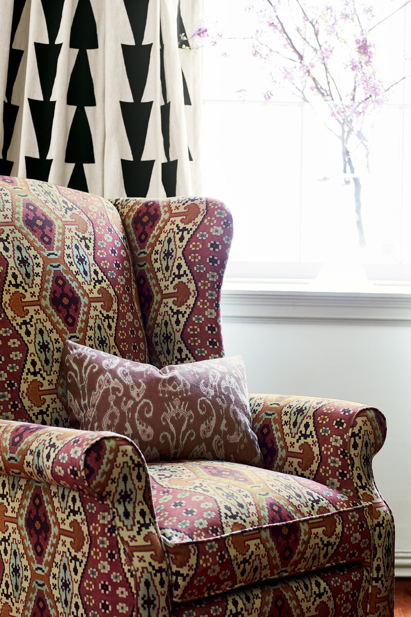 The bold geometrics of Ottoman era robes informed the concept for this unique embroidery. Presented on a natural colored twill ground cloth, Caton is a dramatic design that would make for dynamic, show-stopping drapery.