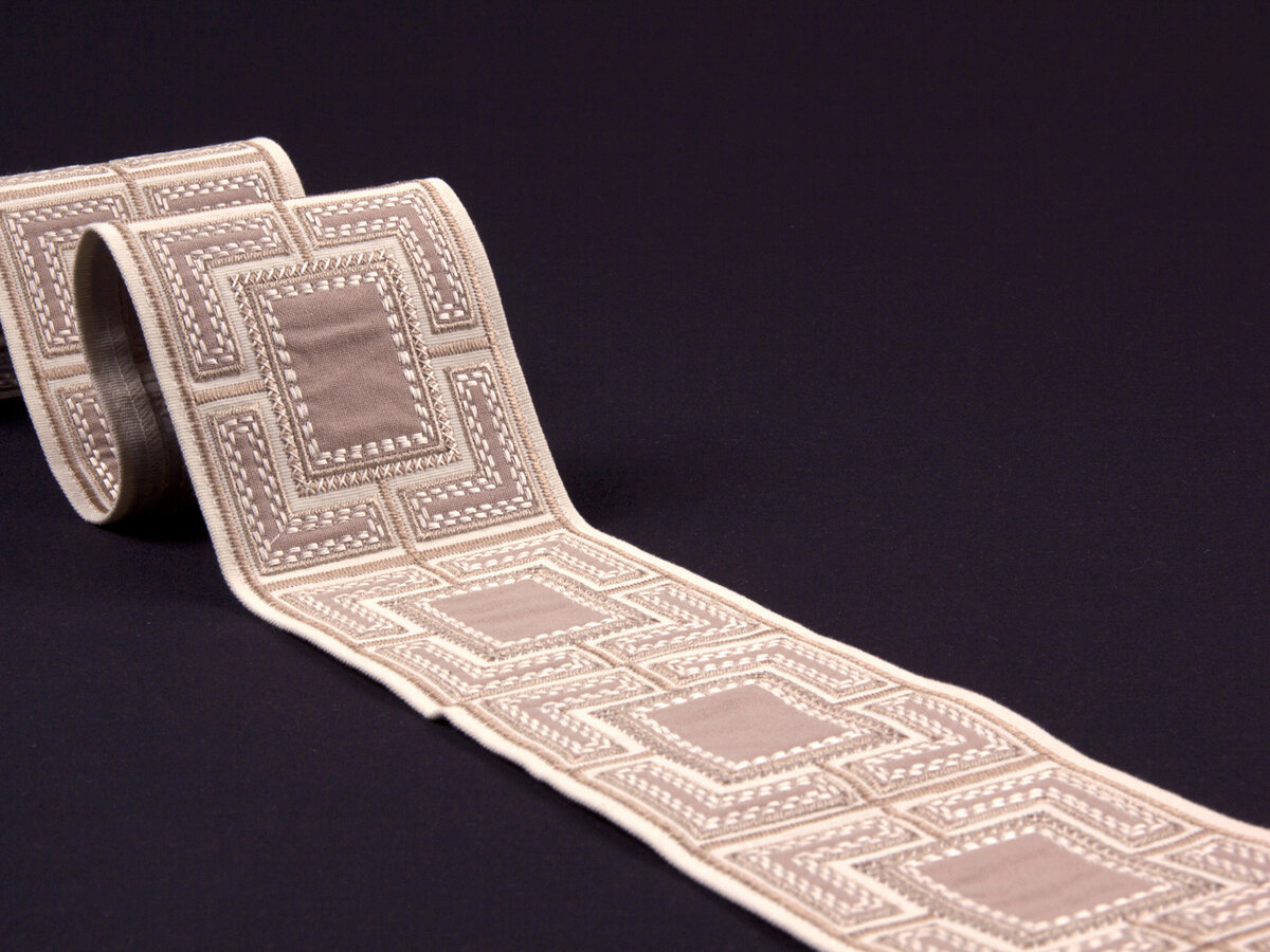Handsome and graphic, this wide border makes a statement when applied to skirted upholstery, draperies or shades. The geometric applique is highlighted by the decorative running stitch that outlines the contours.