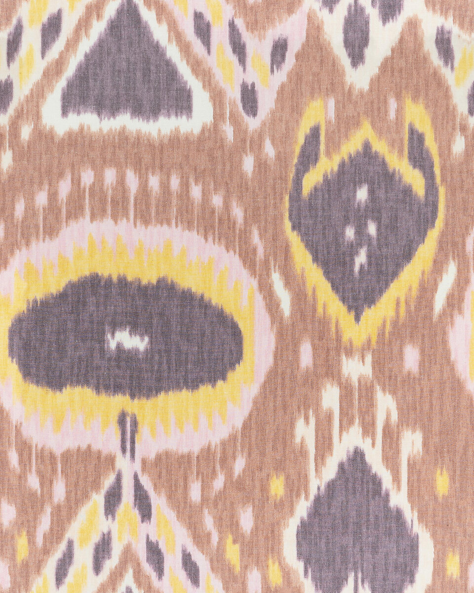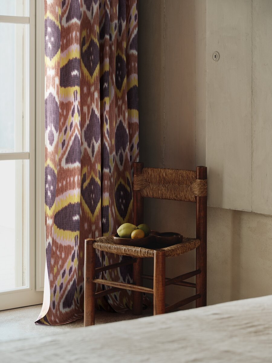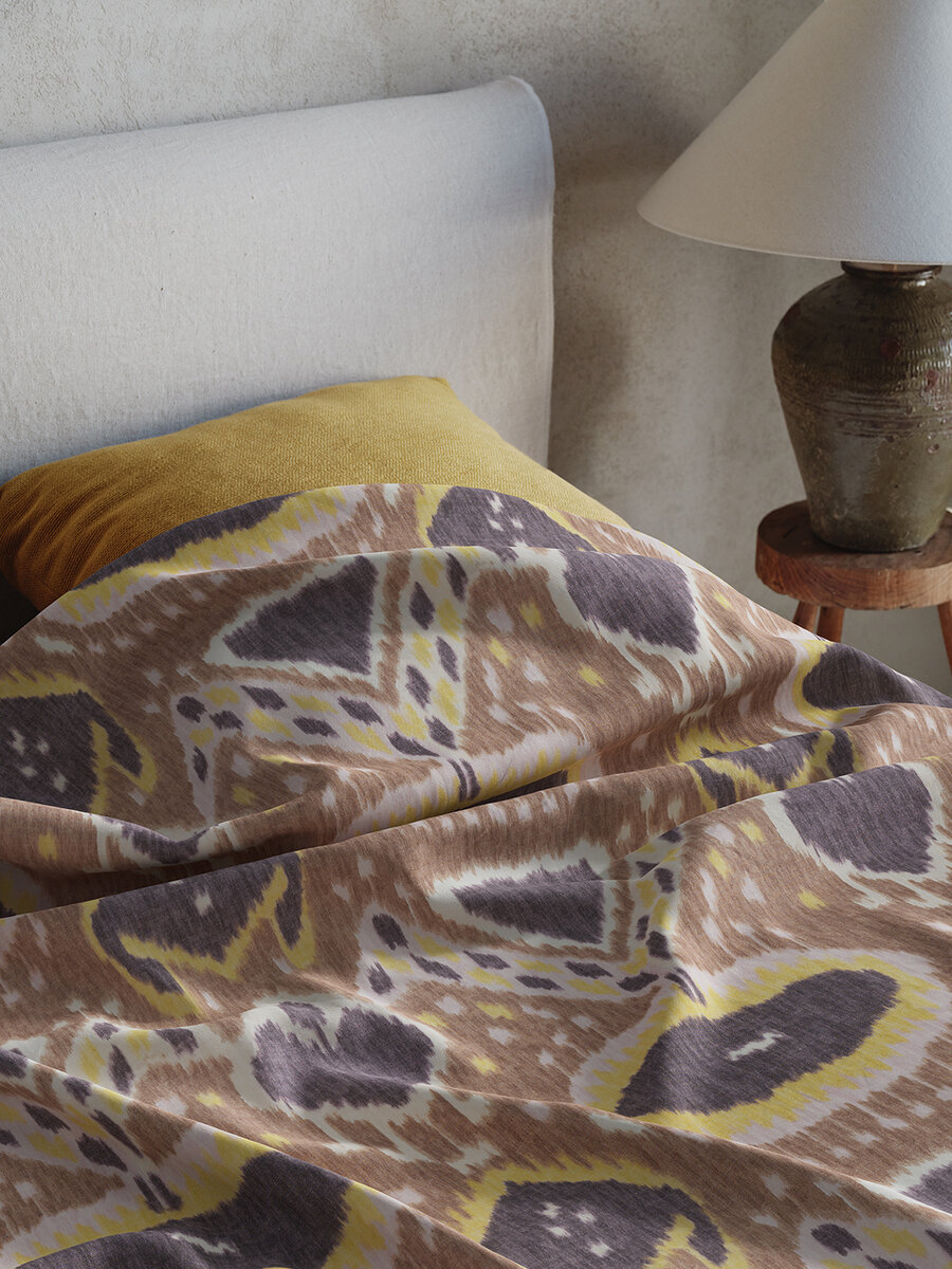 Our Chapan fabric was inspired by traditional 17th-century Uzbek ikat weaving techniques. It is testament to the masterful, traditional craftsmanship of the Kerala region in India.
