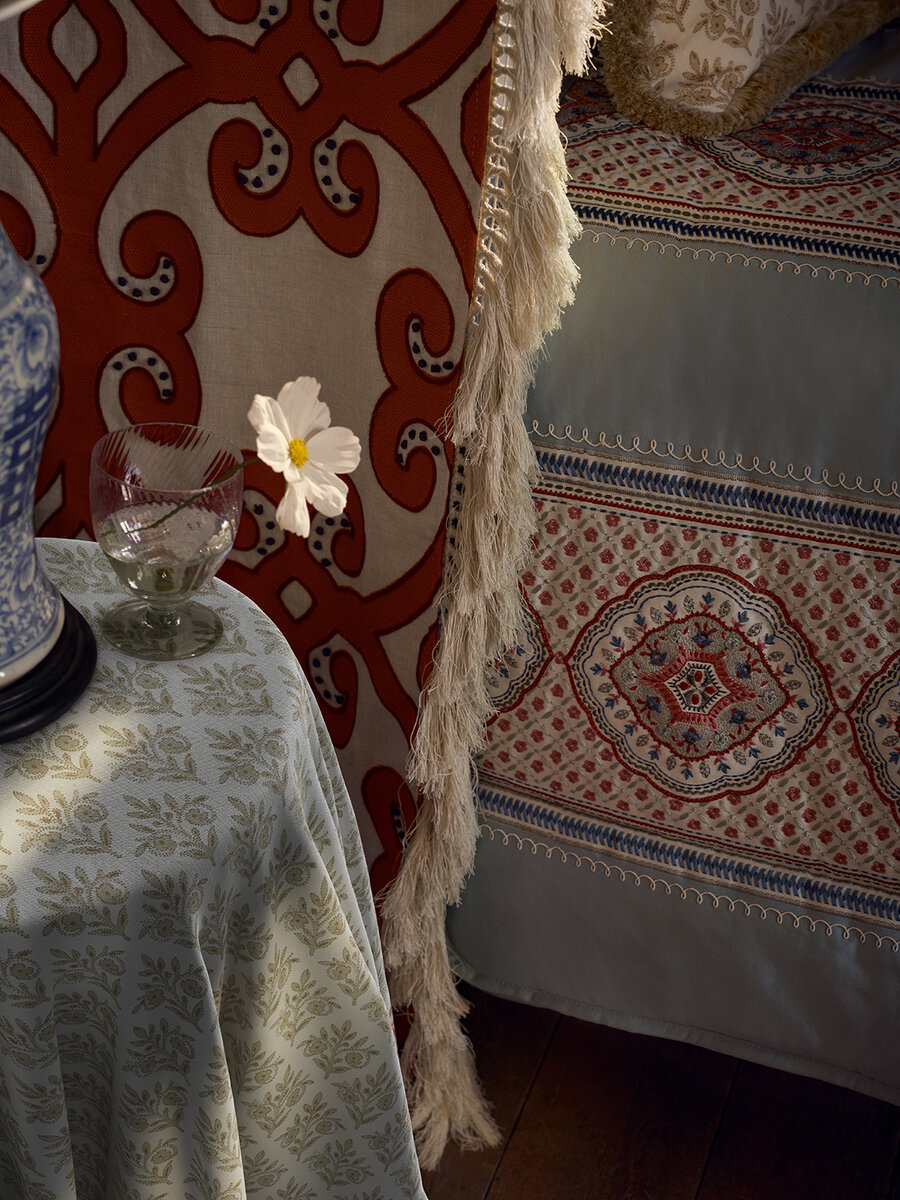 ‘Charlotte’ is a screen-printed design whose charming appeal lies in the deft translation of the original antique woodblock and harmonious balance of the half-drop repeat. Sprightly botanical motifs echo the details of the ‘Anna’ embroidery, across four pretty colourways which perfectly maintain the authenticity of the design.