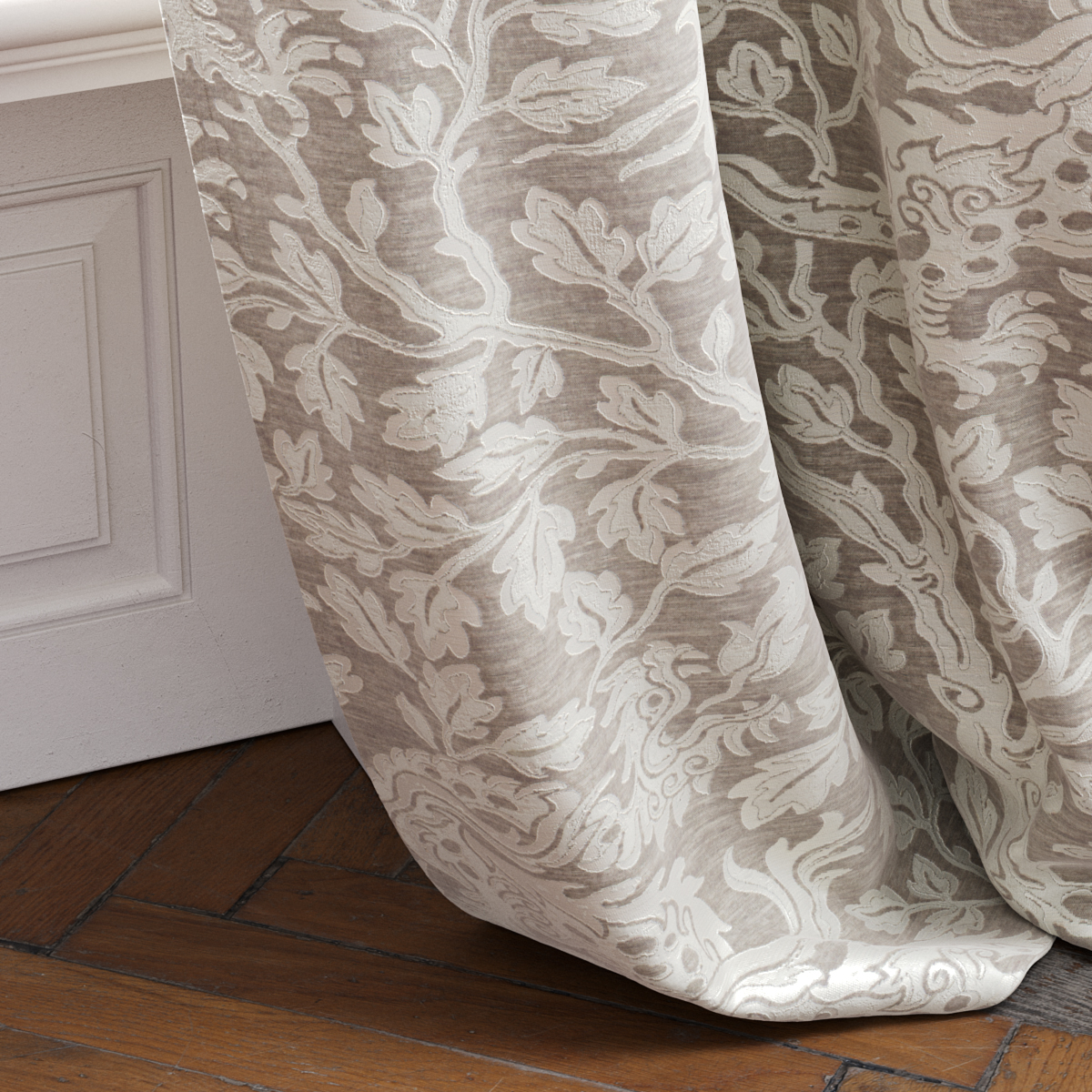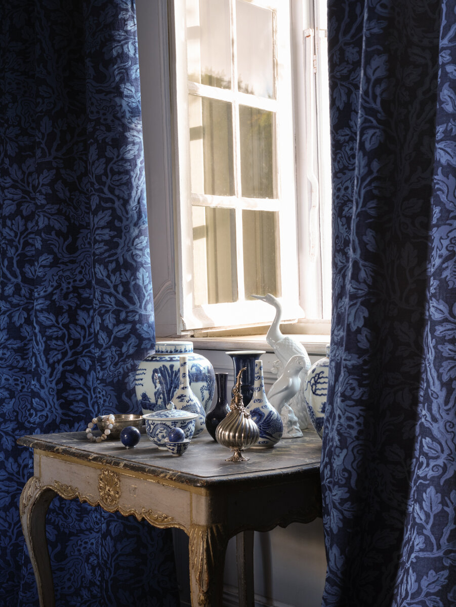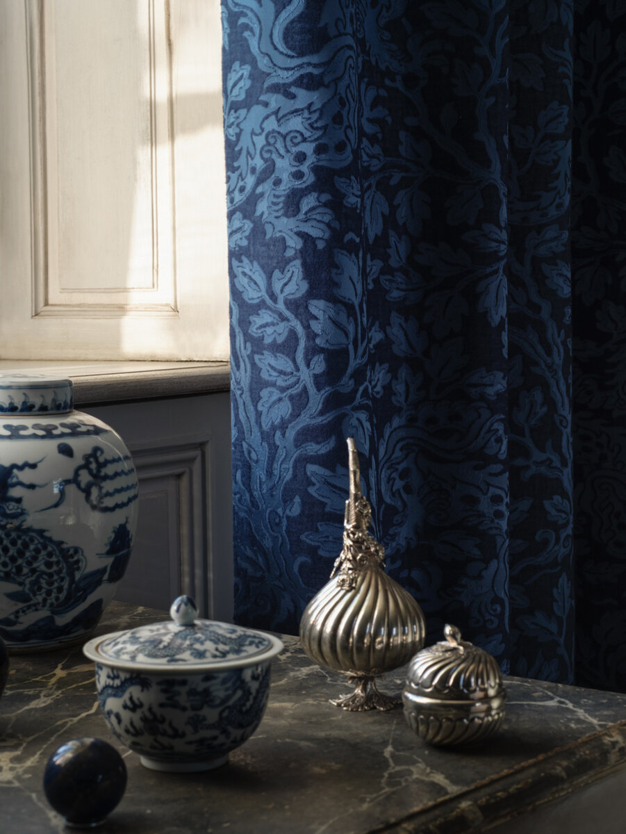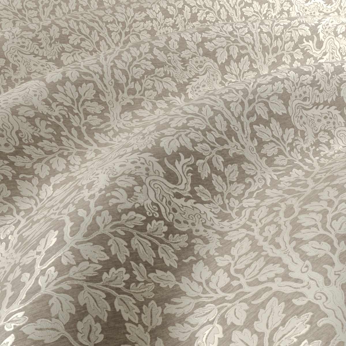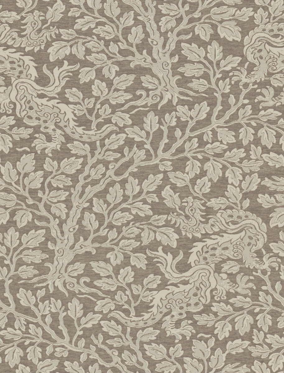 The dragon is a symbol for luck, peace and long life in Asian culture – and the creative impulse for the design of CHENGLEI DRAGON, a two-colored satin weave with an Asian-inspired allover dragon design. Woven on a very fine silk-like warp as an elaborate Jacquard, the auspicious mythical creatures cavort through a dense background of leaf work. After weaving, the fabric is finished with a gentle brush, giving it a modern, softly flowing character and a wonderfully soft feel.