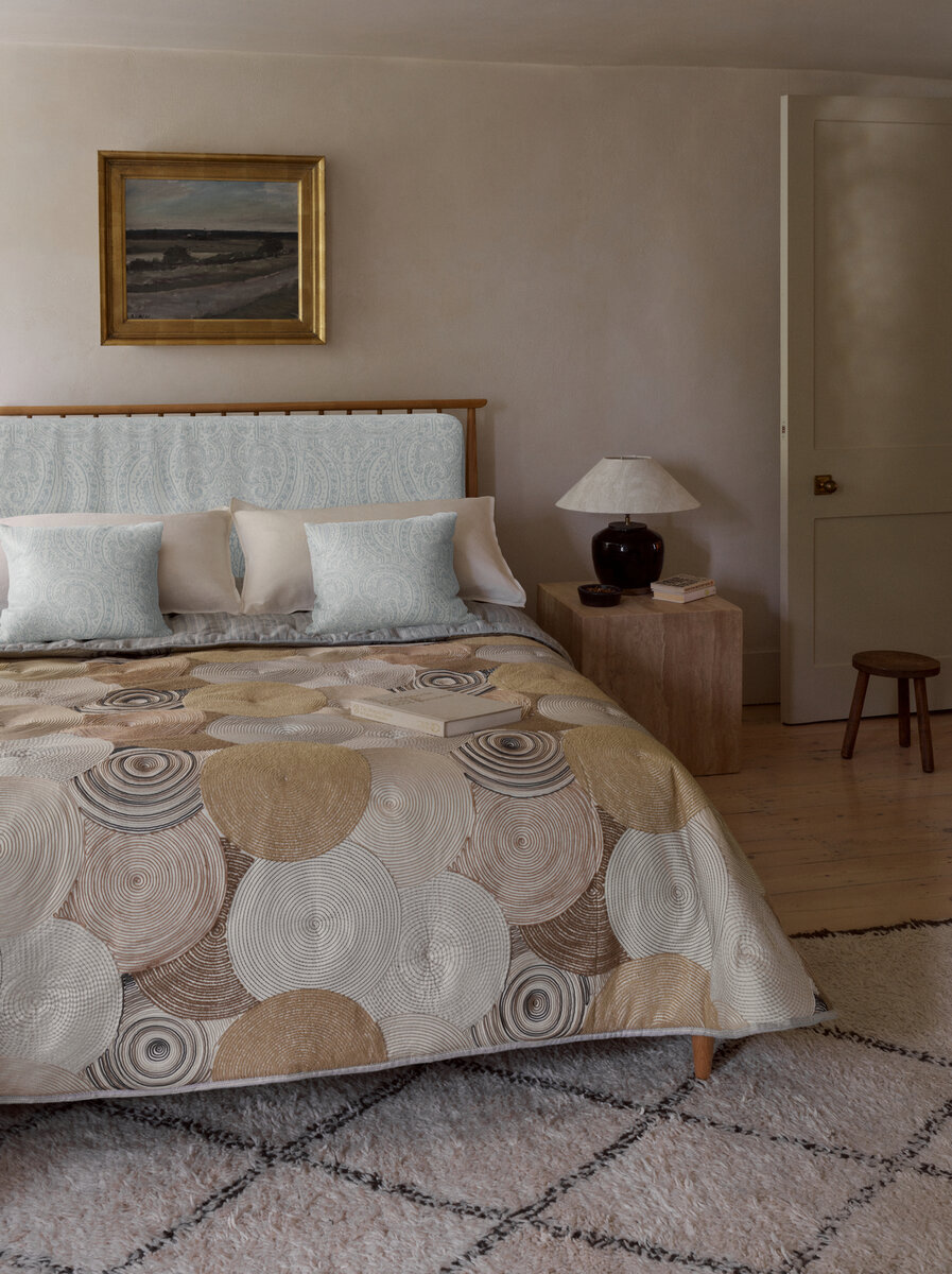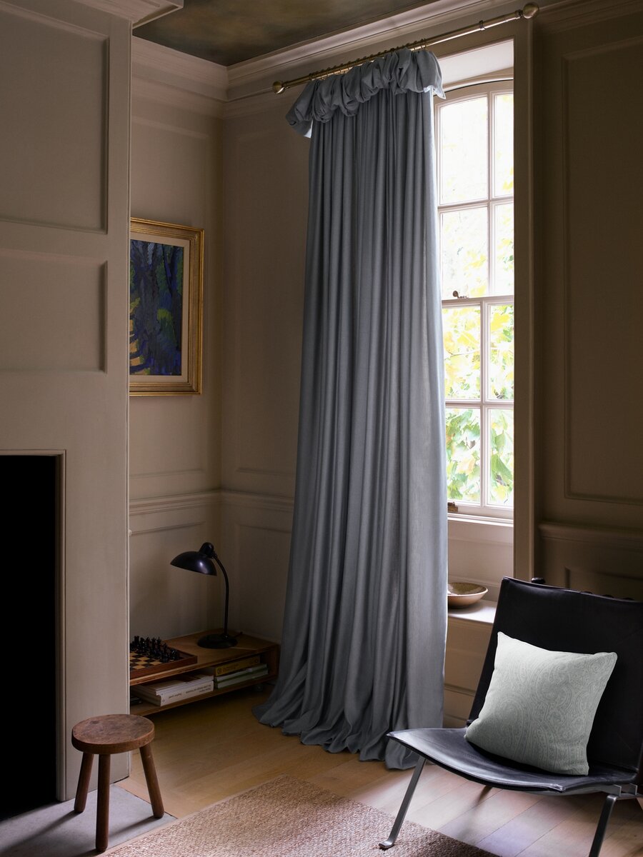 ‘Chiswick’ is a sumptuous silk-wool fabric in a classical damask design, inspired by the rich interiors of Chiswick House, London, where William Kent designed the gardens. Gentle curves are broken by a subtle distortion in the weave that blurs and softens the design, giving the impression of water droplets cascading from a fountain.