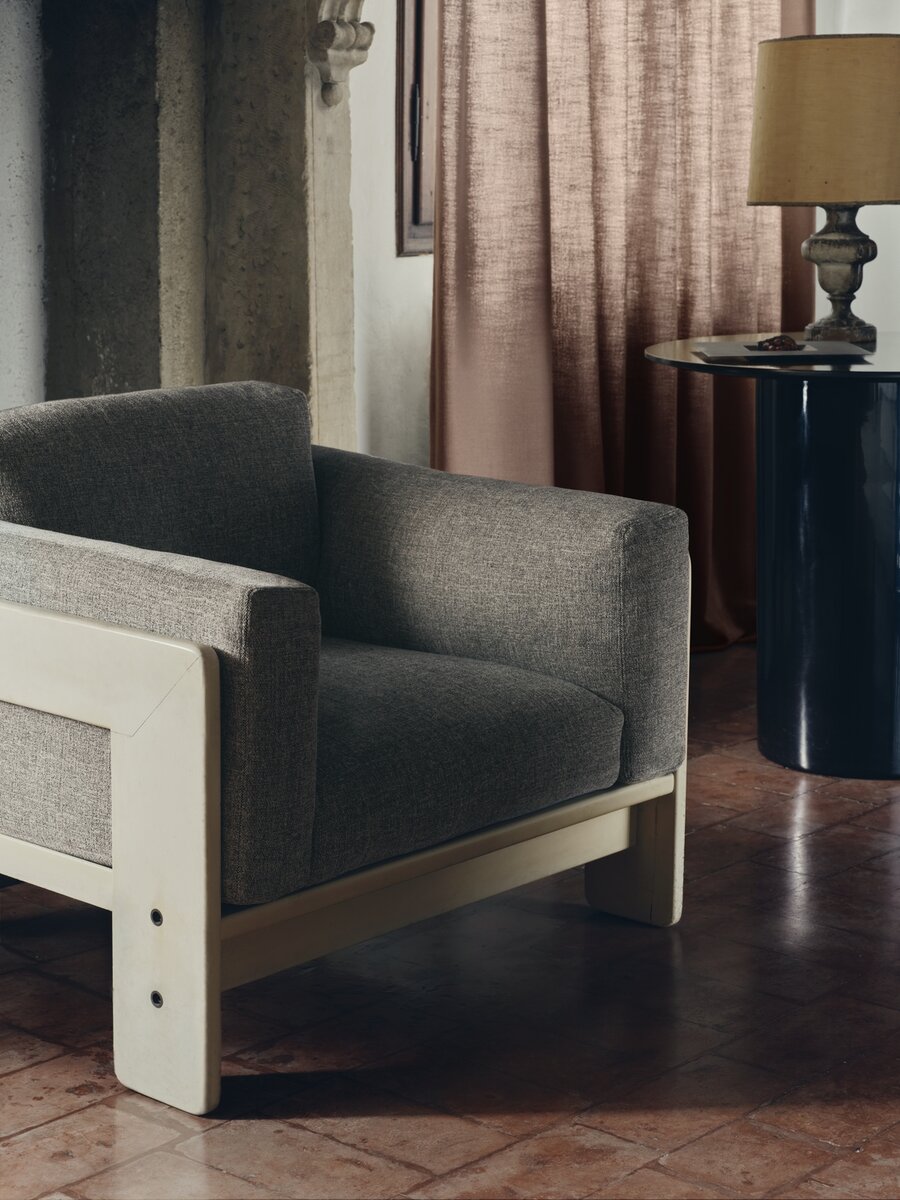 The highlight of this floor-to-ceiling Inbetween fabric is its clear color combined with the expressive texture of the woven yarns.