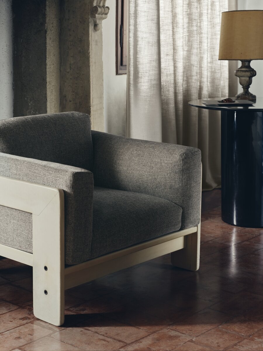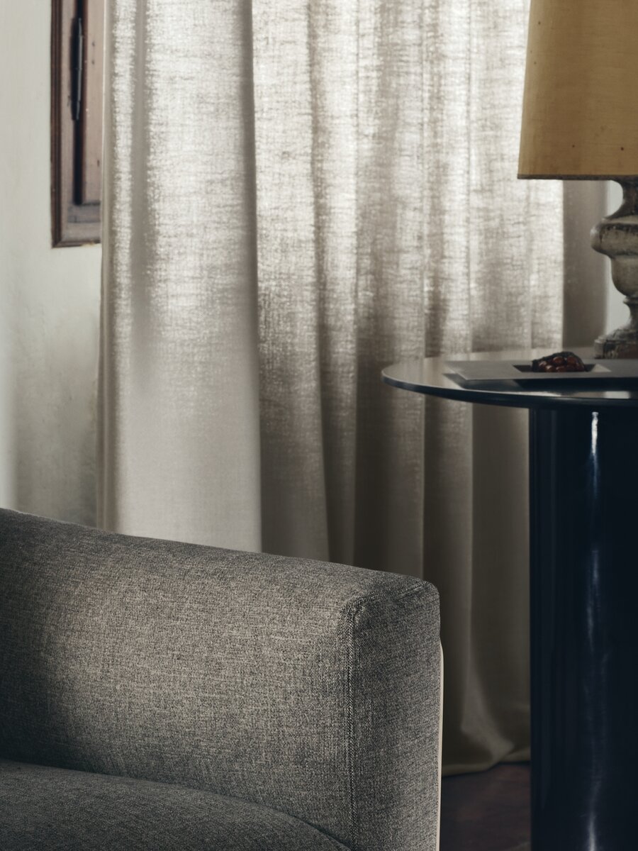 The highlight of this floor-to-ceiling Inbetween fabric is its clear color combined with the expressive texture of the woven yarns.