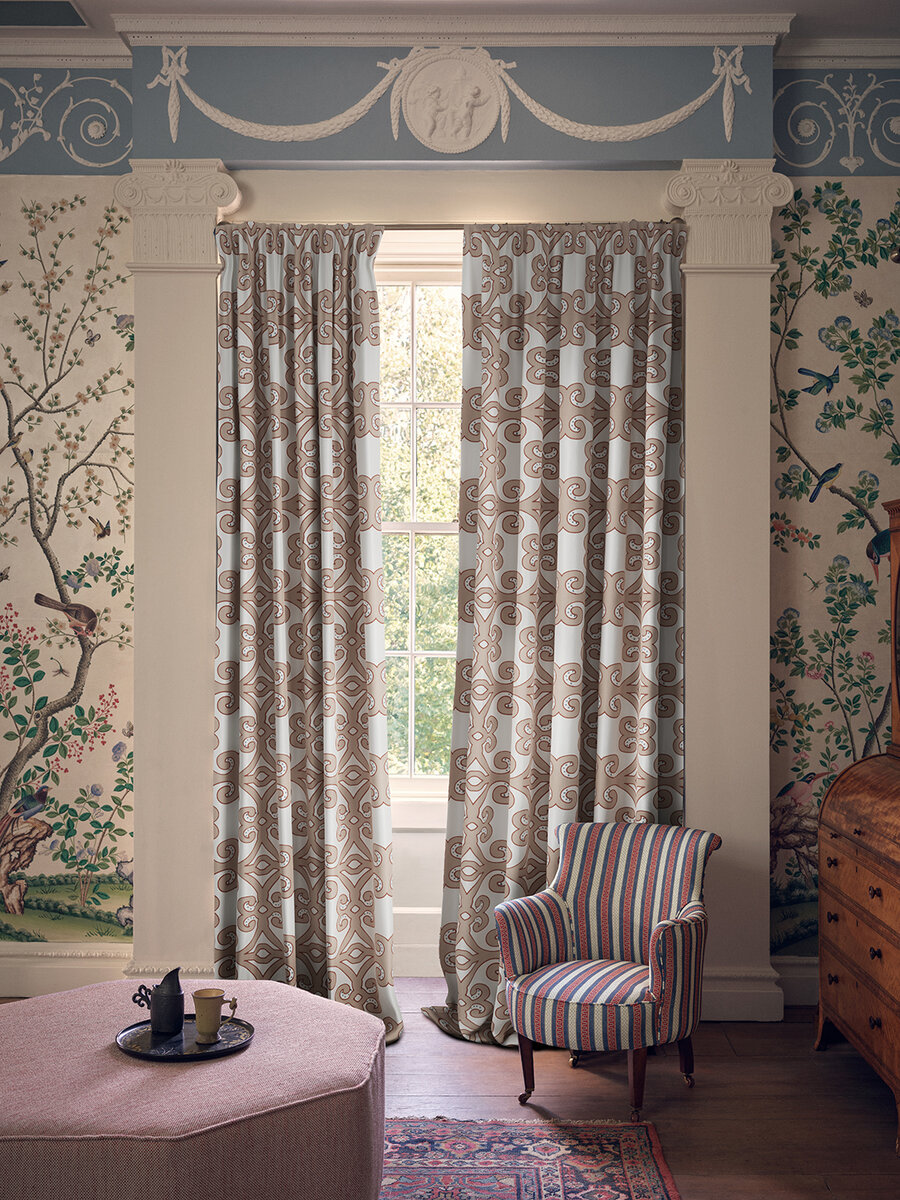 A striking trellis design referencing classical architecture, ‘Collonade’ is a large-scale design that makes a statement. Hand-embroidered French knots decorate the curves of Palladian-inspired crewel work, softening the structure, adding a flair of craftsmanship and giving a contemporary edge to an otherwise traditional design language.