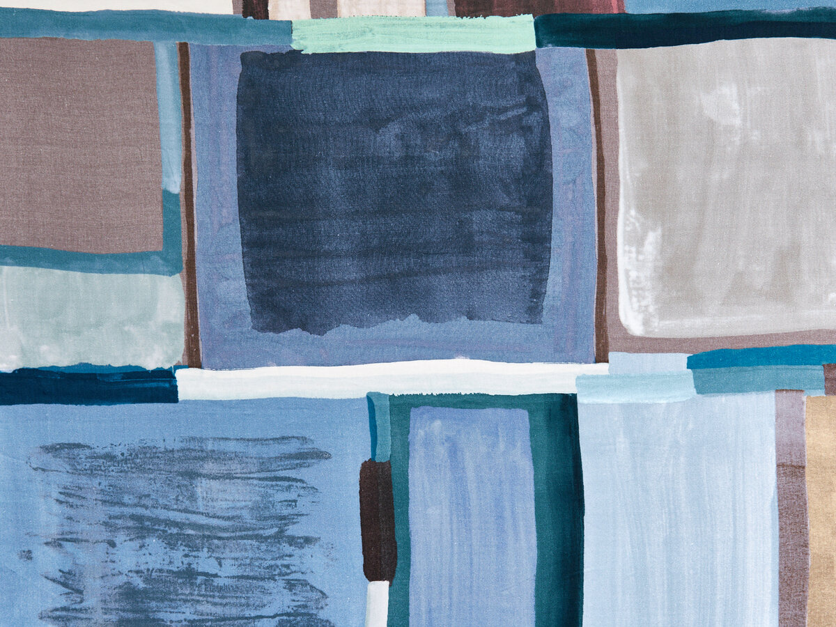 The linen print fabric COLOUR STUDY reflects the liveliness and spontaneity of an intuitively created brush sketch. In a painterly hand, large and small color fields in soft tones and strong colors are juxtaposed, developing an intense depth of color on the elegantly shimmering linen satin.