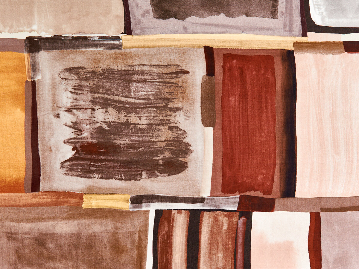 The linen print fabric COLOUR STUDY reflects the liveliness and spontaneity of an intuitively created brush sketch. In a painterly hand, large and small color fields in soft tones and strong colors are juxtaposed, developing an intense depth of color on the elegantly shimmering linen satin.