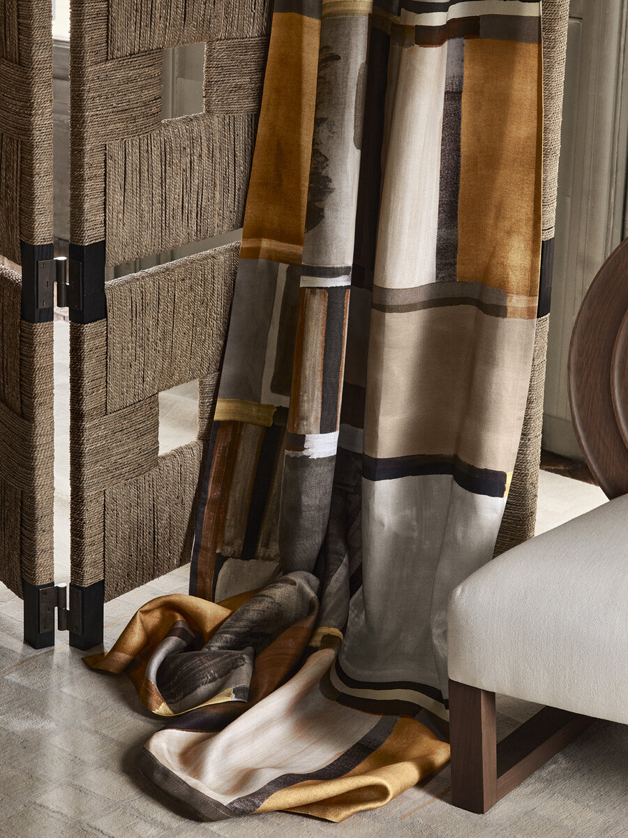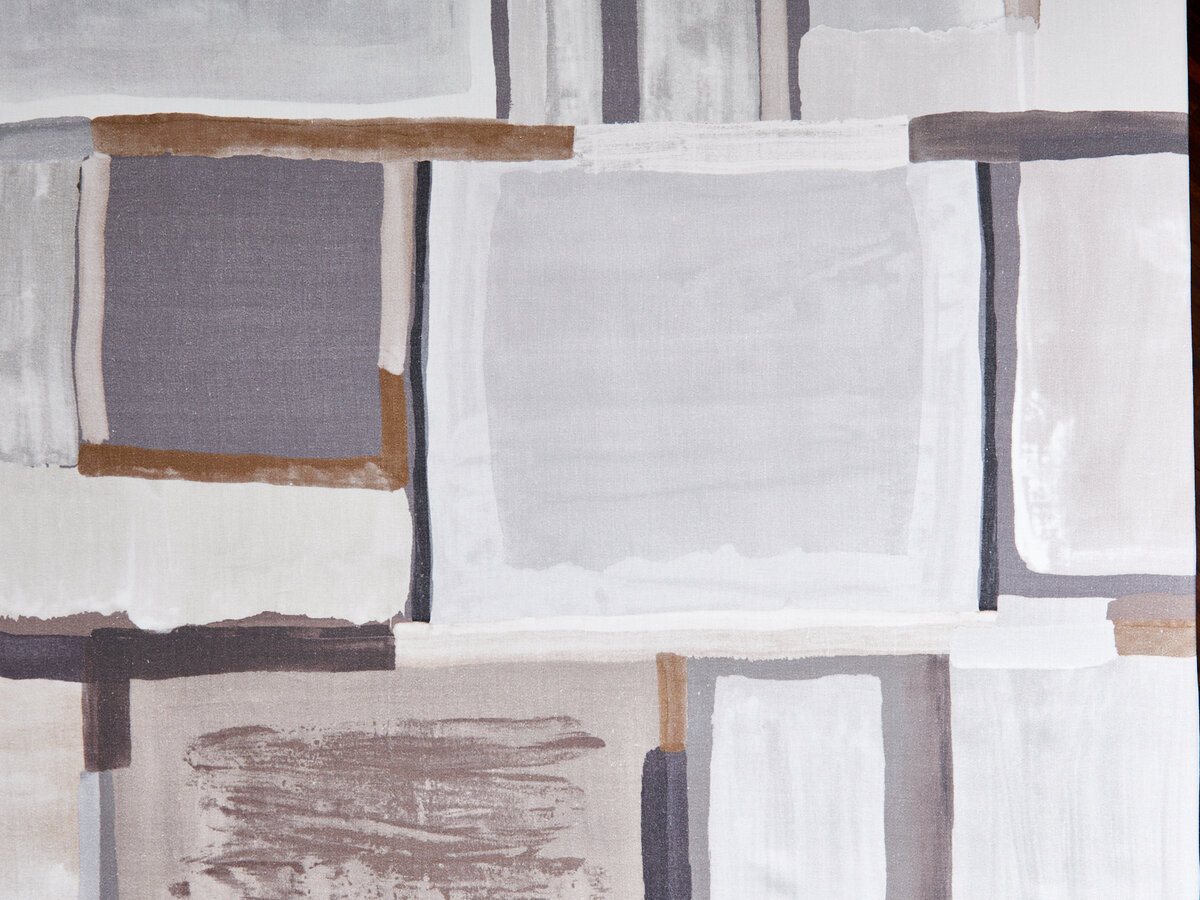 The linen print fabric COLOUR STUDY reflects the liveliness and spontaneity of an intuitively created brush sketch. In a painterly hand, large and small color fields in soft tones and strong colors are juxtaposed, developing an intense depth of color on the elegantly shimmering linen satin.