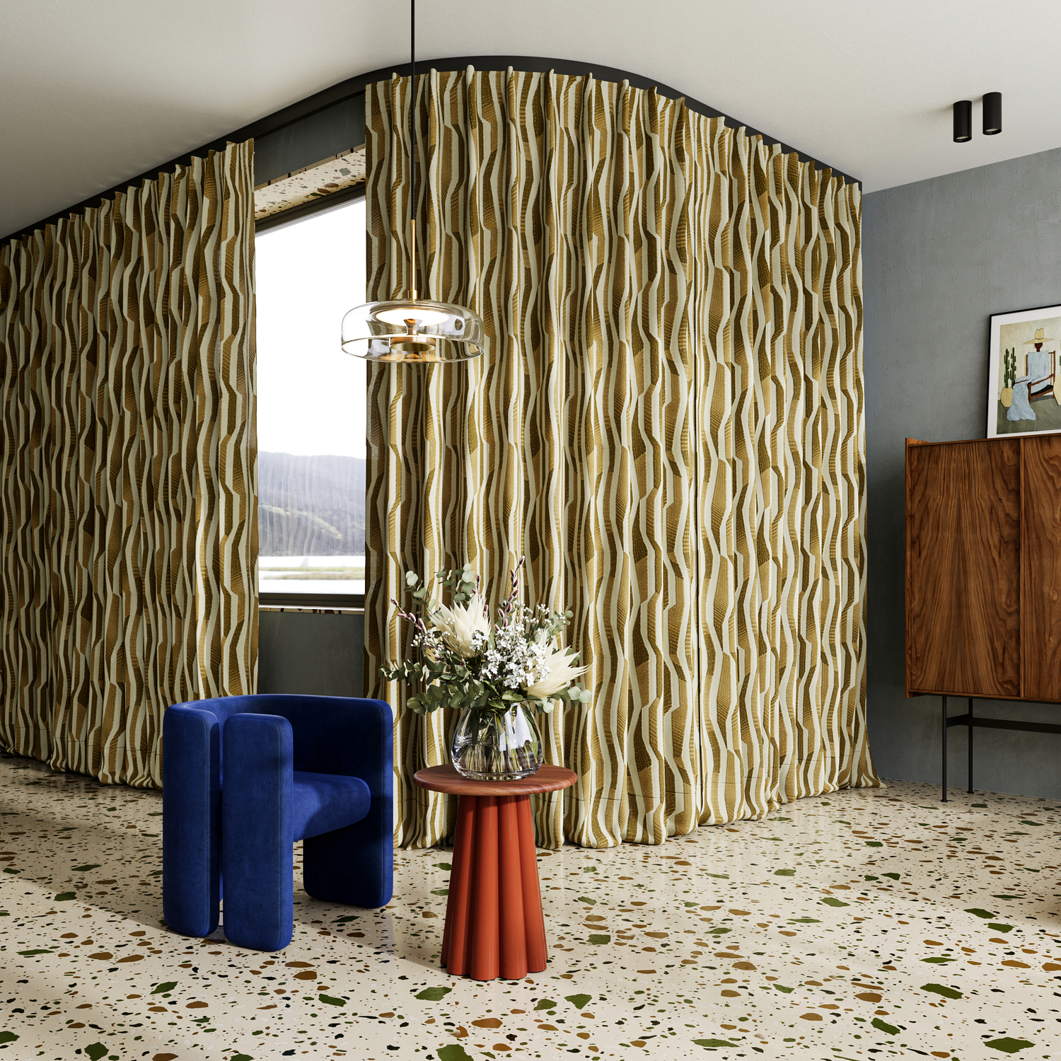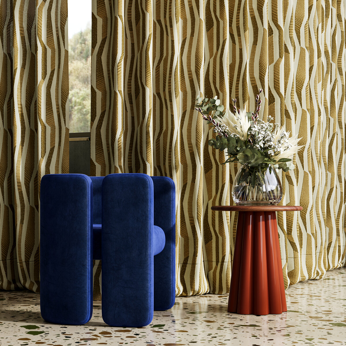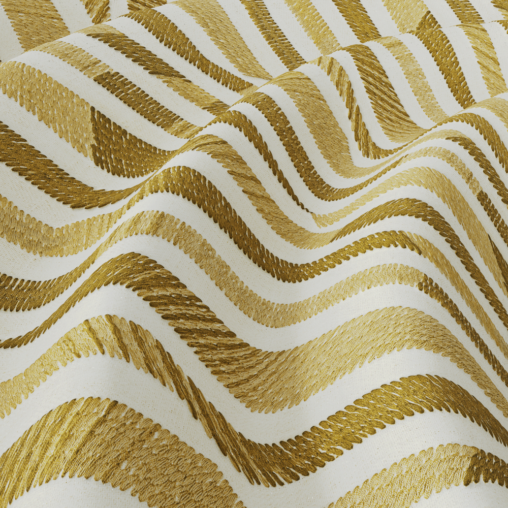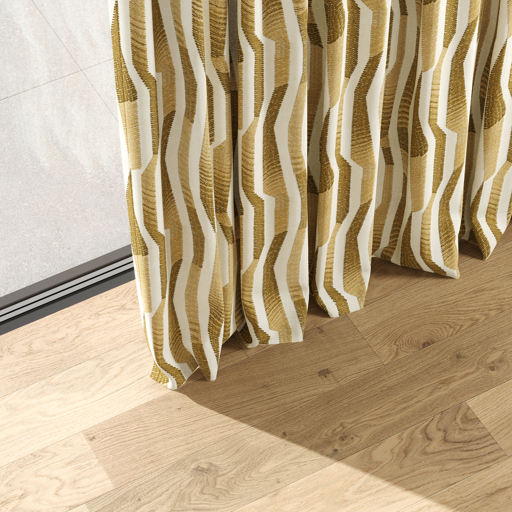 COLUMN is like a modern work of art, elegantly framed by a window. The contemporary embroidery against the authentic herringbone background makes each linear meter unique. The dense, voluminous blend of cotton, linen, polyester, and viscose exudes a constant, laid-back feeling. A key feature is the unique color gradient that gives COLUMN its sculptural appearance. A must-have in mustard, this fabric is equally stunning in azure blue or charcoal.