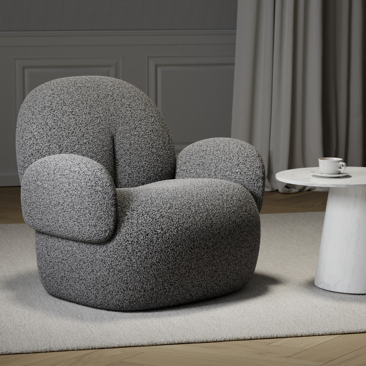 Noticeably soft and voluminous. For this expressive color mélange, boucle yarns in three different color nuances are brought together in warp and weft. The result is a high-comfort upholstery fabric with a dense woolen texture. Feel COMFY BOUCLÉ.