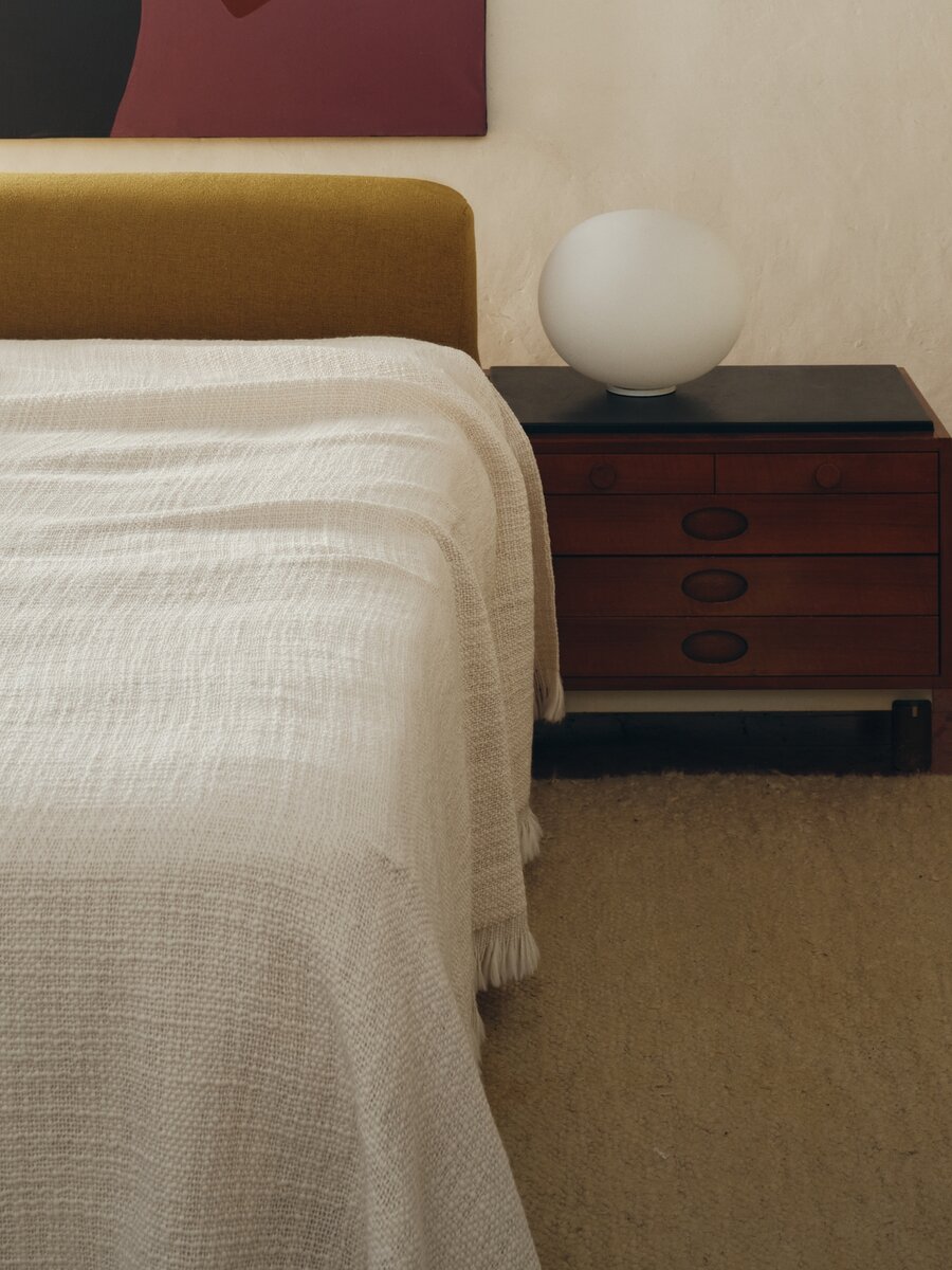 Every fiber of this masterfully woven fabric exudes luxury and naturalness. The loosely structured flammé yarn combined with the openwork grid structure accentuates not only the sophisticated character of the wool blend but invites you to reach out and touch it. A gorgeous detail is the selvedge edge with the extra-long fringing, which could be used as a unique eye-catcher, whether as a window treatment, cushion, or cozy throw.