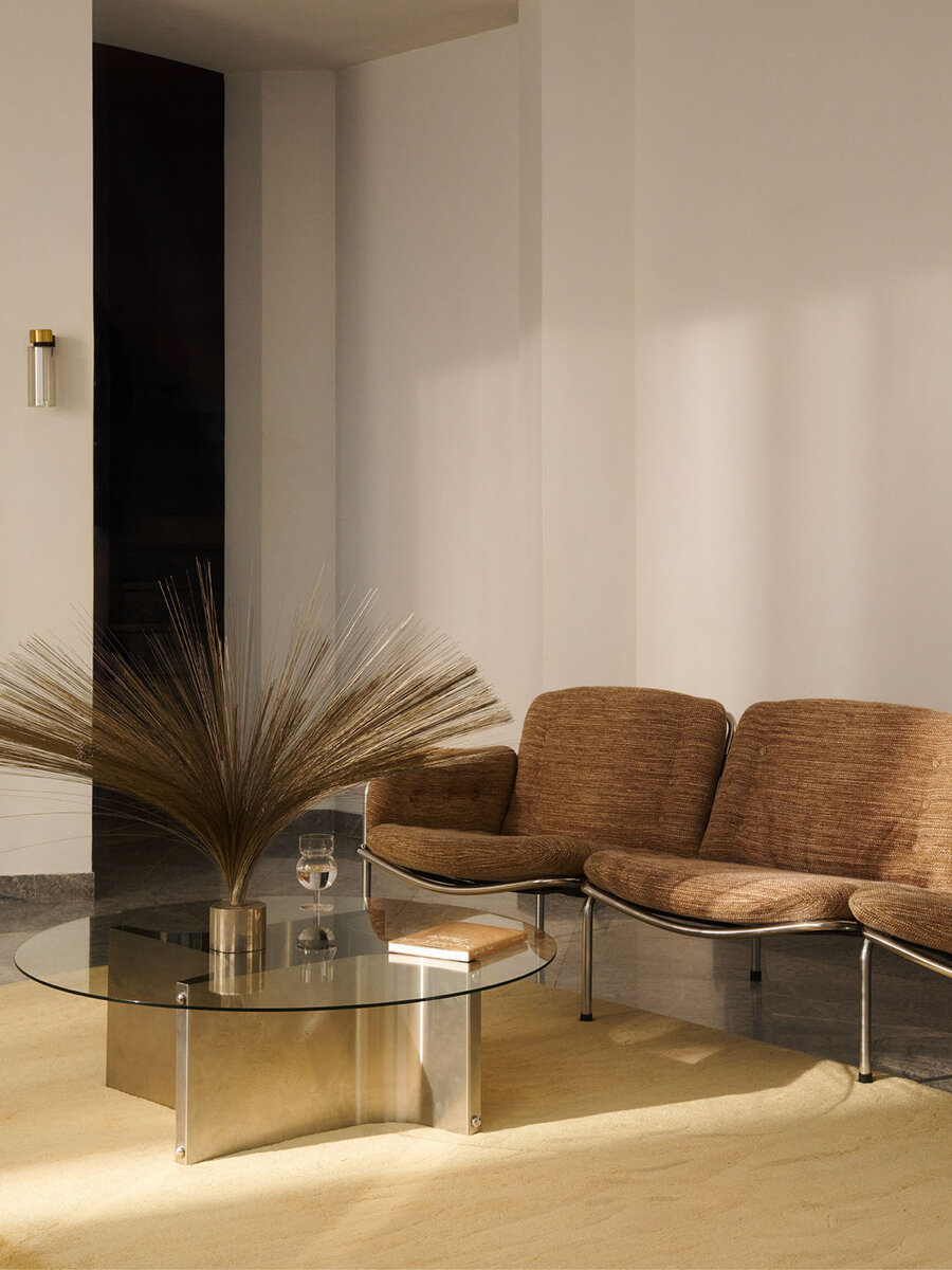 The color palette is inspired by the interplay of natural surfaces, including warm neutrals such as raffia and cocoa, reddish earth hues, and more intense tones such as Indian yellow and acacia green.