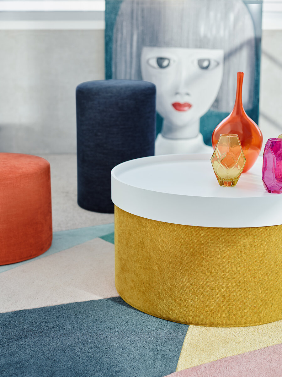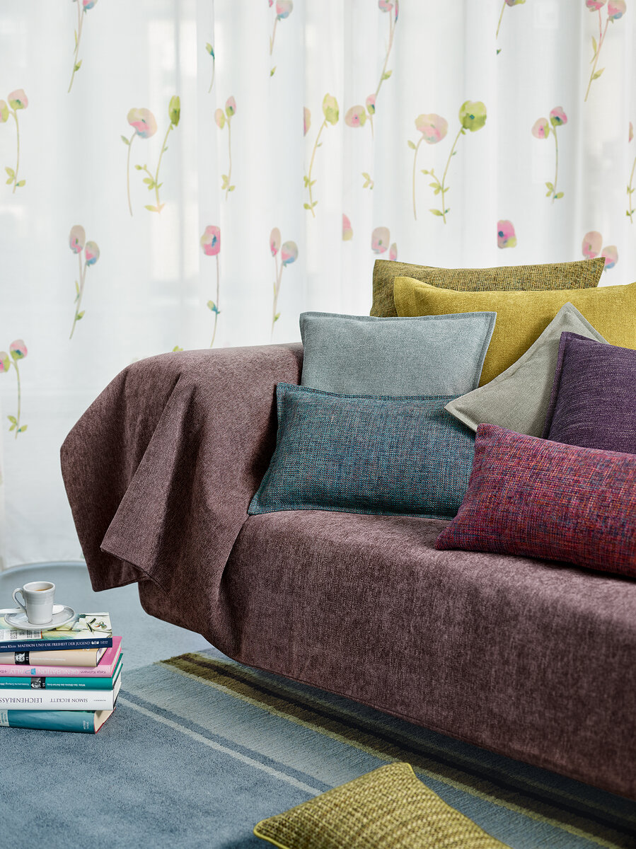 With a pleasant, soft feel and a delicate lustre, this sin-gle-colour yarn can be used equally well as a decorative fabric or an upholstery fabric. Its fine chenille yarns gain a cloudy colour effect through a special finish, giving the fabric vibrancy. It can be used alone or in combination with Talis.