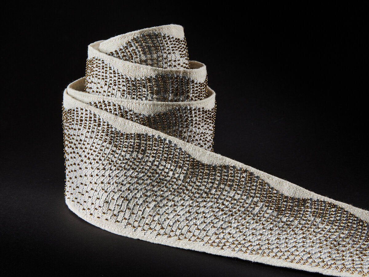 DESKEY is an elegant wave design comprised of sinuous embroidery and impeccable beading. It is a tribute to its namesake Donald Deskey, the legendary Art Deco designer best known for the 1932 interiors of Radio City Music Hall. Detailed computer embroidered dots are first applied to a linen base fabric. The beads are then hand embroidered, placed one by one in a precise pattern to create a gradual ombre. A labour of love, three to four people work together to produce four meters of DESKEY per day.