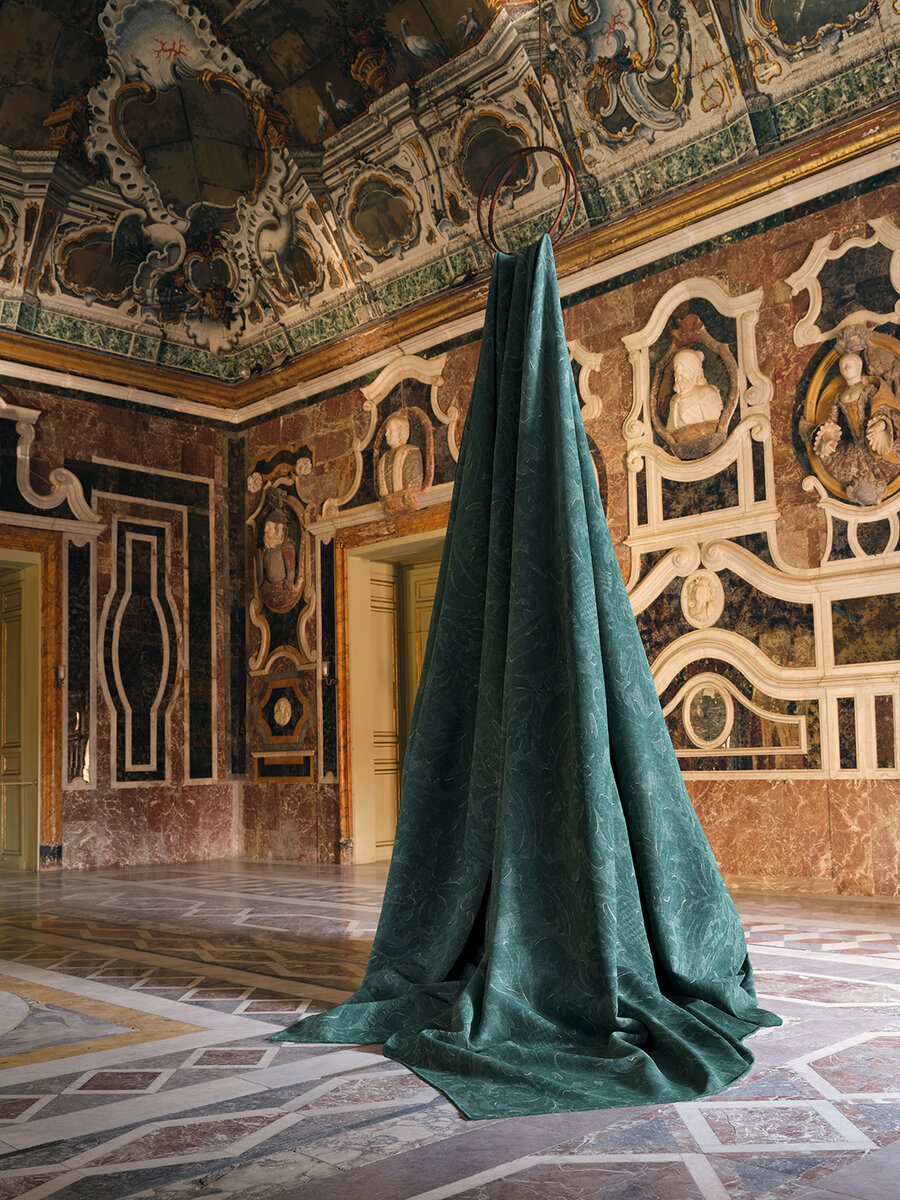 Printed digitally on the finest Italian linen base fabric and embellished with hand-painted brushstrokes, the arabesque motives are highlighted, underlining the sophistication of this Italian-made fabric.